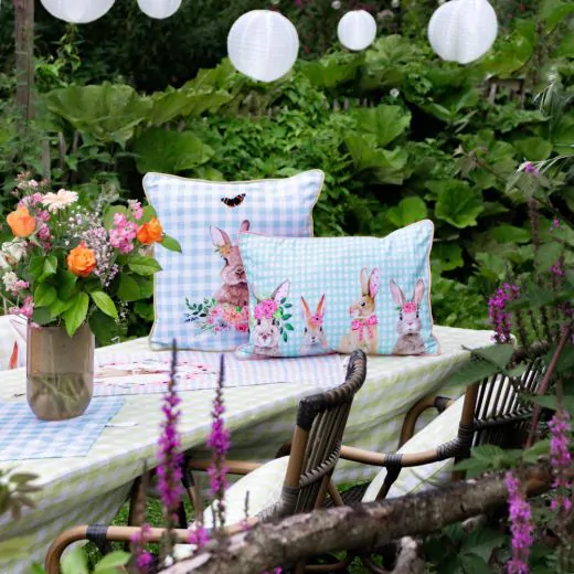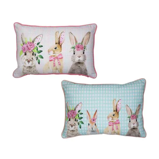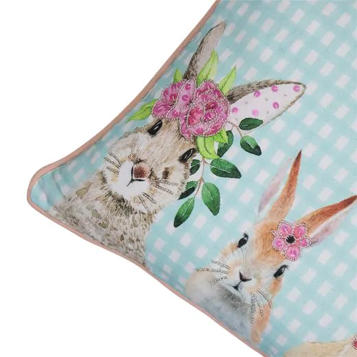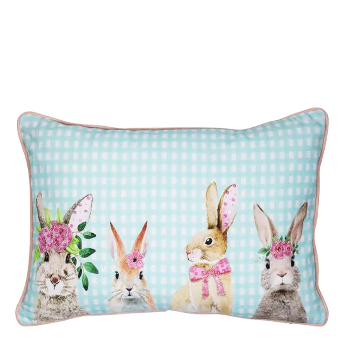 Baumwoll Kissen Hasen, 4 Kaninchen mit Blumen, hellblau-weiß kariert, 35x45cm, Mars & More