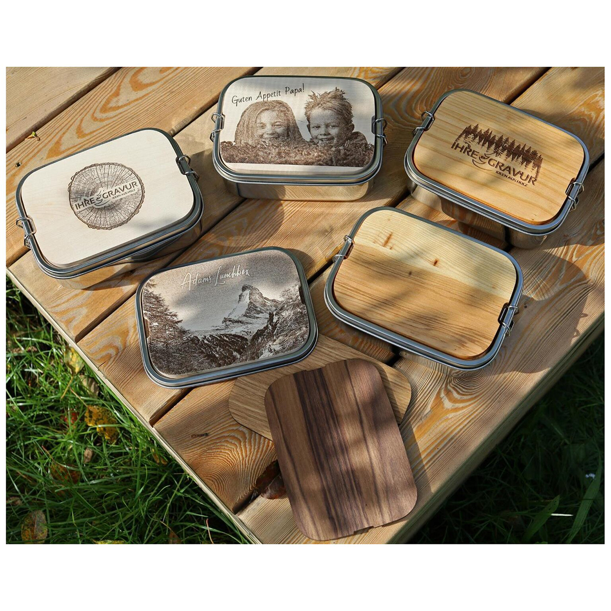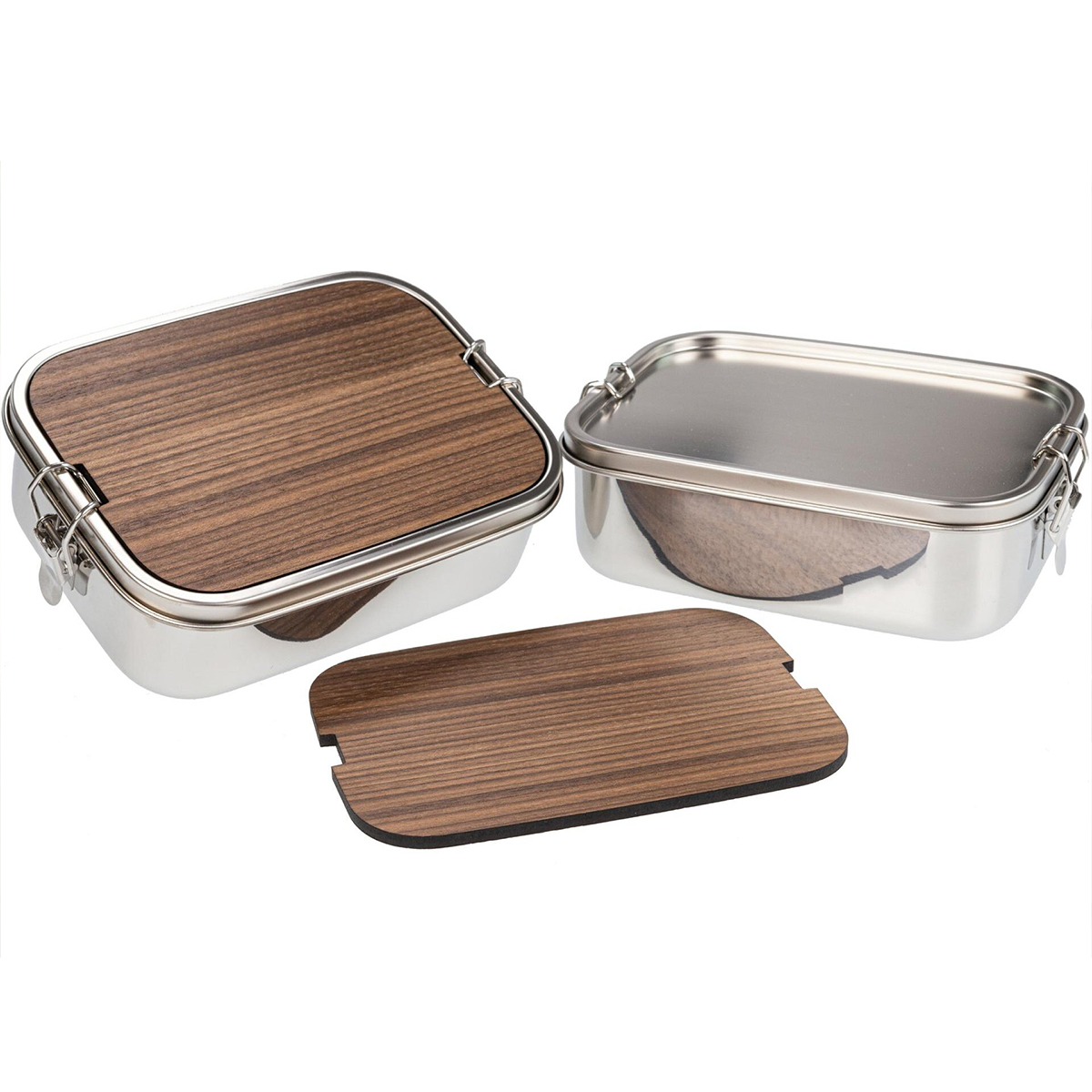 Diese hochwertige Brotzeitbox aus Edelstahl mit edlem Nußbaum Holzbrett verbindet Funktionalität mit natürlicher Ästhetik.