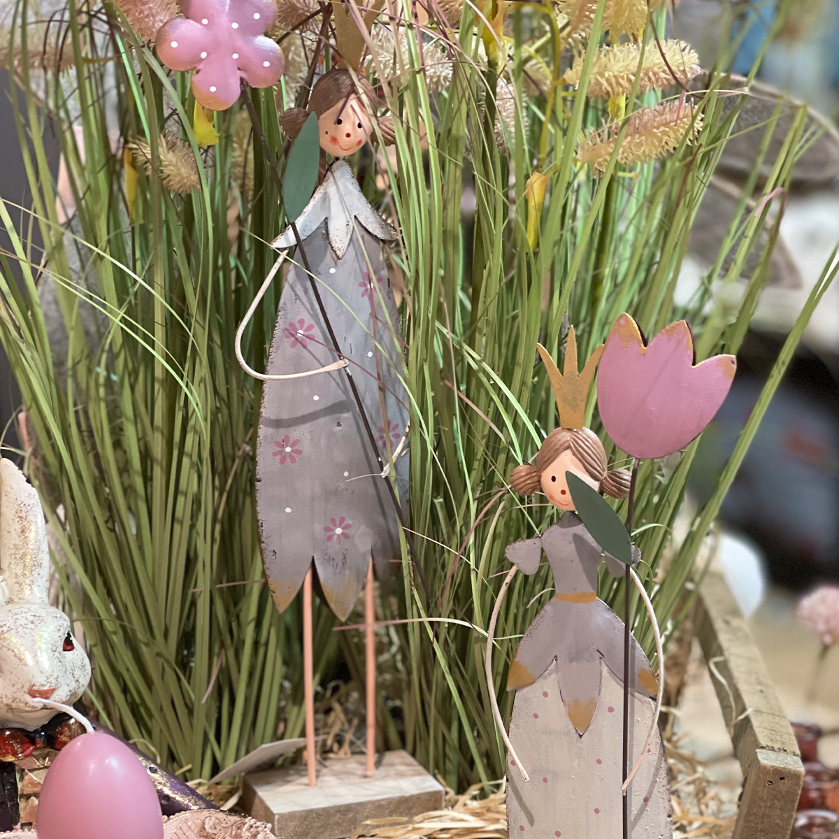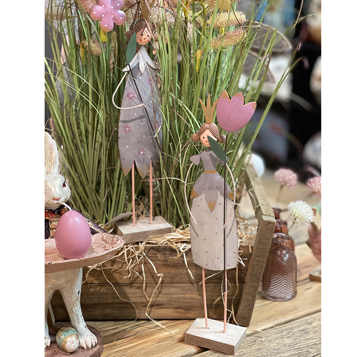 Deko Blumenmädchen mit Blume, Blumenkönigin creme und grau, 36x12cm, Metall, Set/2