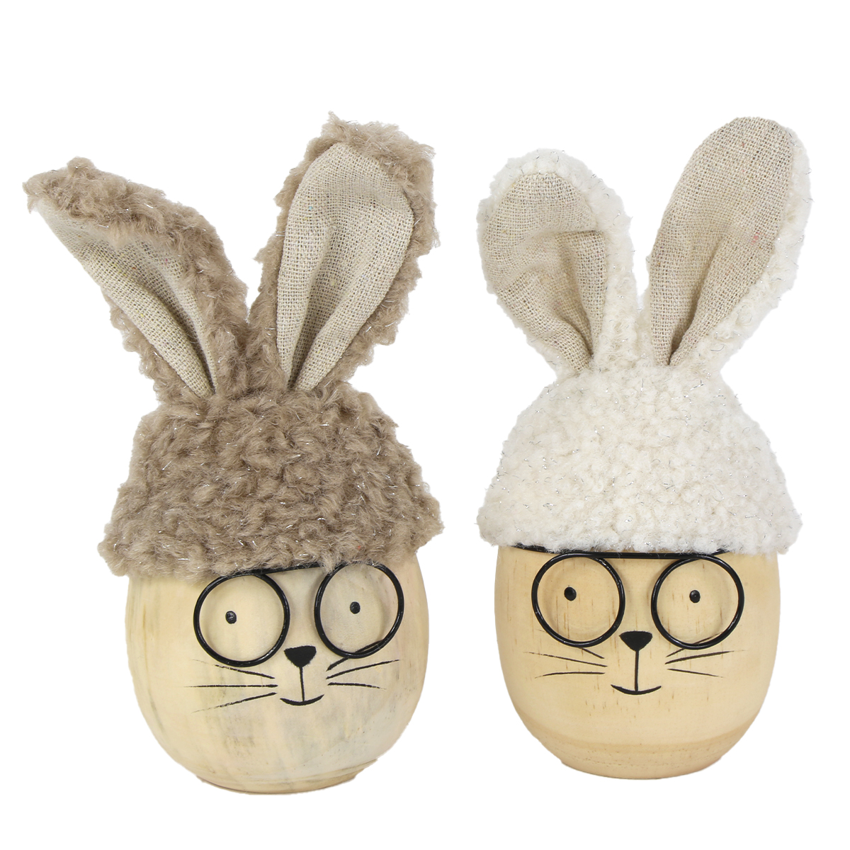 Deko Ei Hase, Holzei Hase mit Brille und Plüschmütze, hellbraun, 17cm