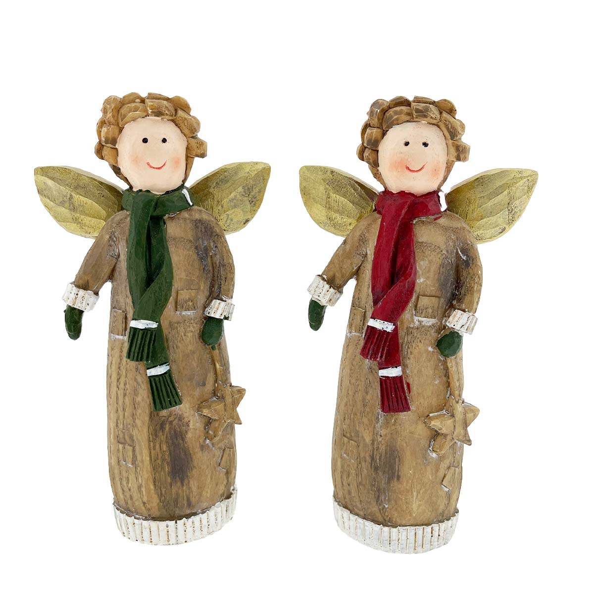 Deko Engel, Weihnachtsengel in holzoptik mit rotem Schal und Handschuhe, 18cm