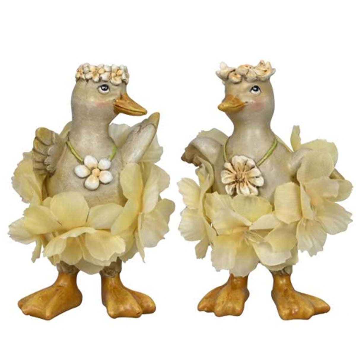 Deko Ente mit Blumenrock, putzige Poly-Ente mit Blütenkranz, 11cm