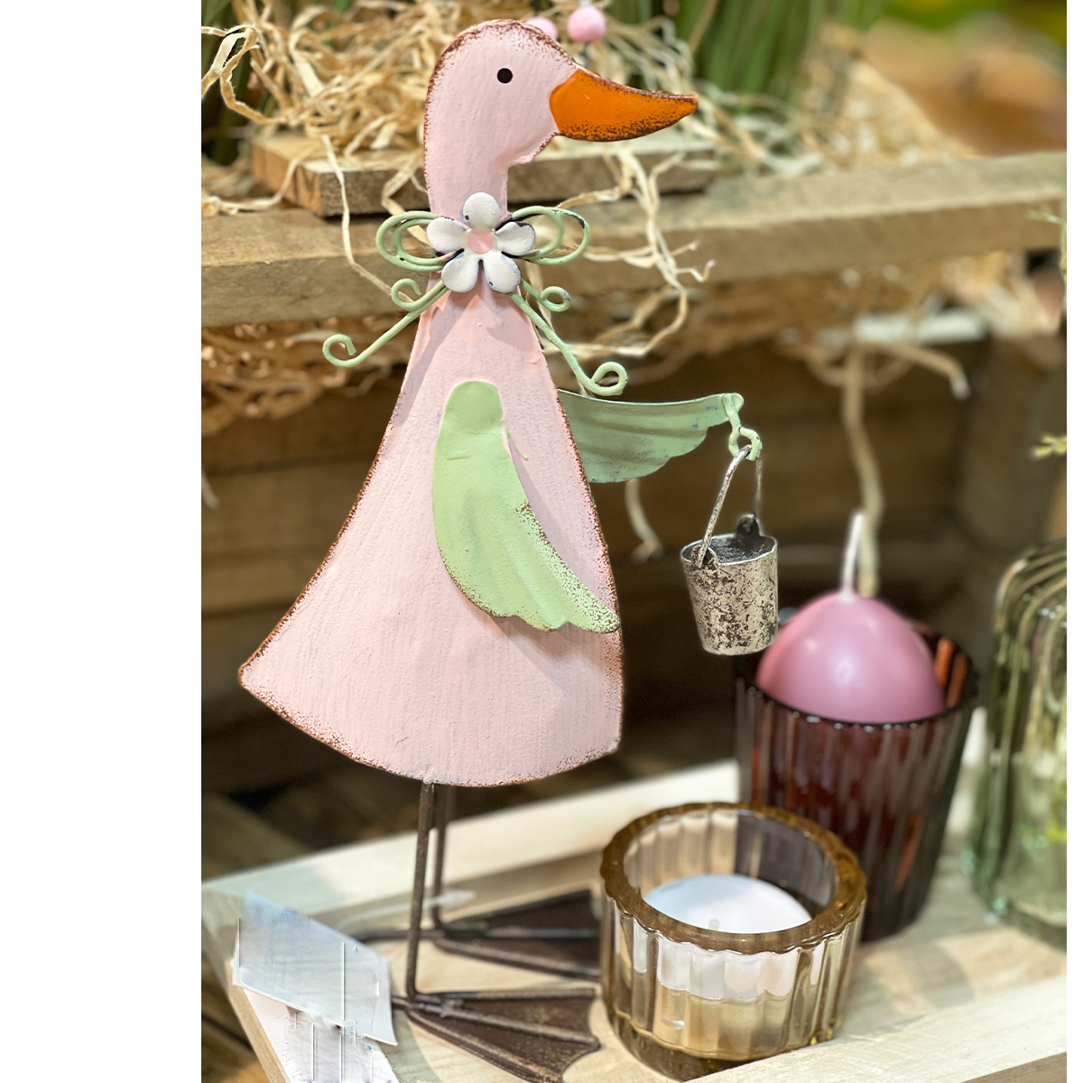 Deko Ente mit Eimer, rosa, 20cm, Metall