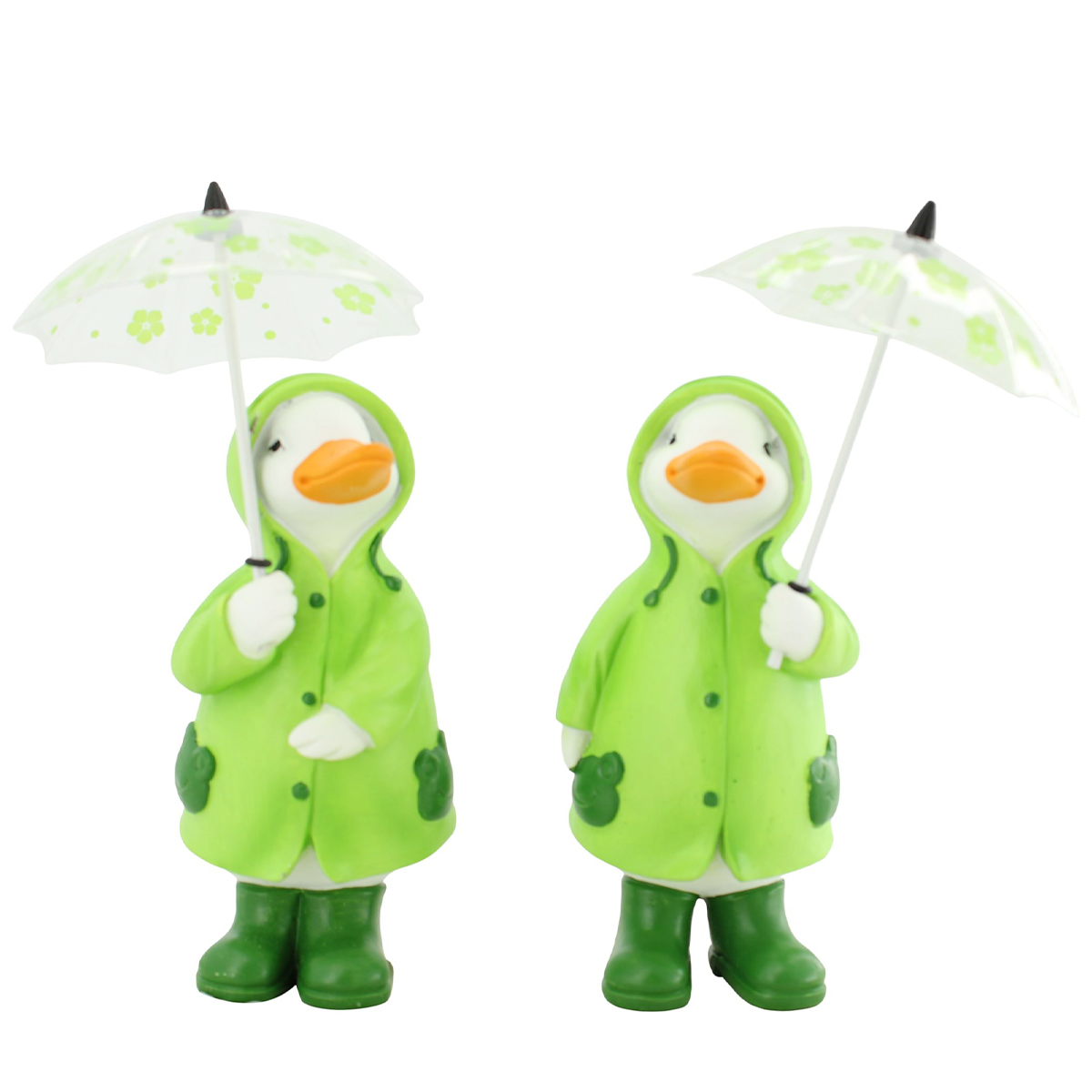 Deko Ente mit Schirm, Polyente im grünen Regenmantel und Gummistiefel, 15cm