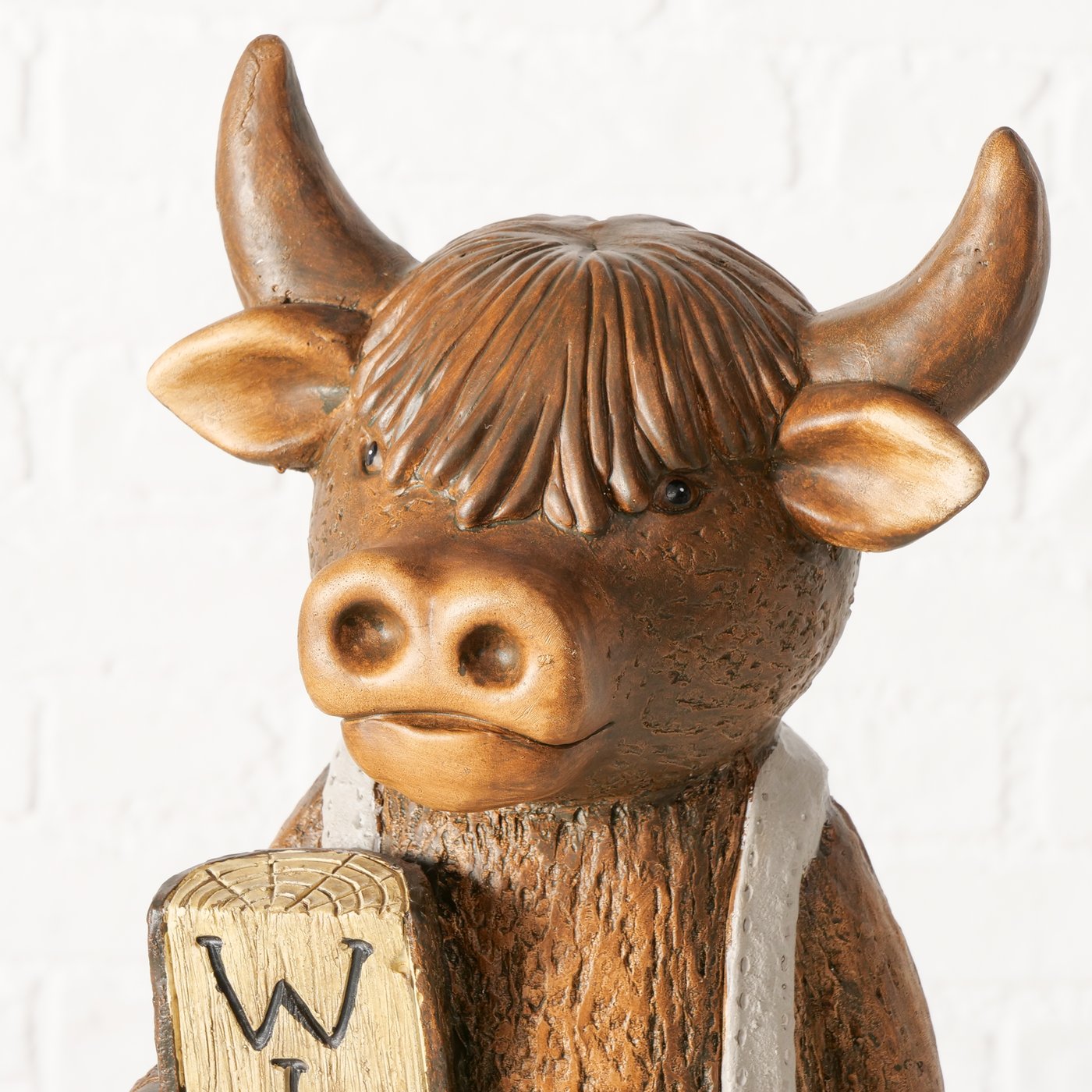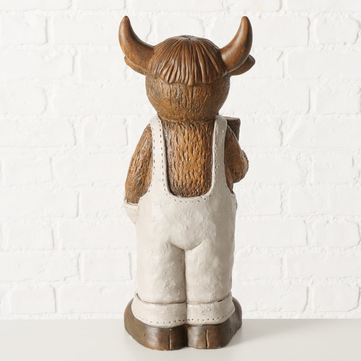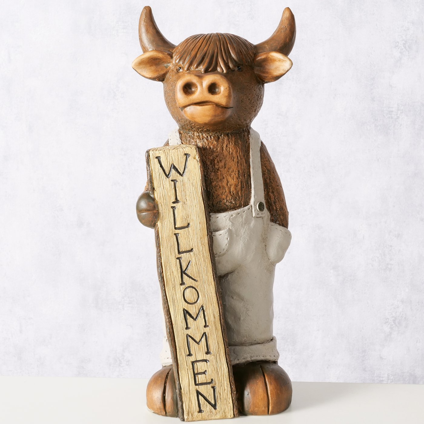Deko Figur Schottisches Hochlandrind Buffi Willkommen, Hochlandrind mit Latzhose und Schild, Boltze Home Collections