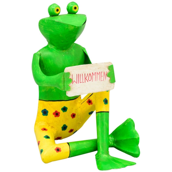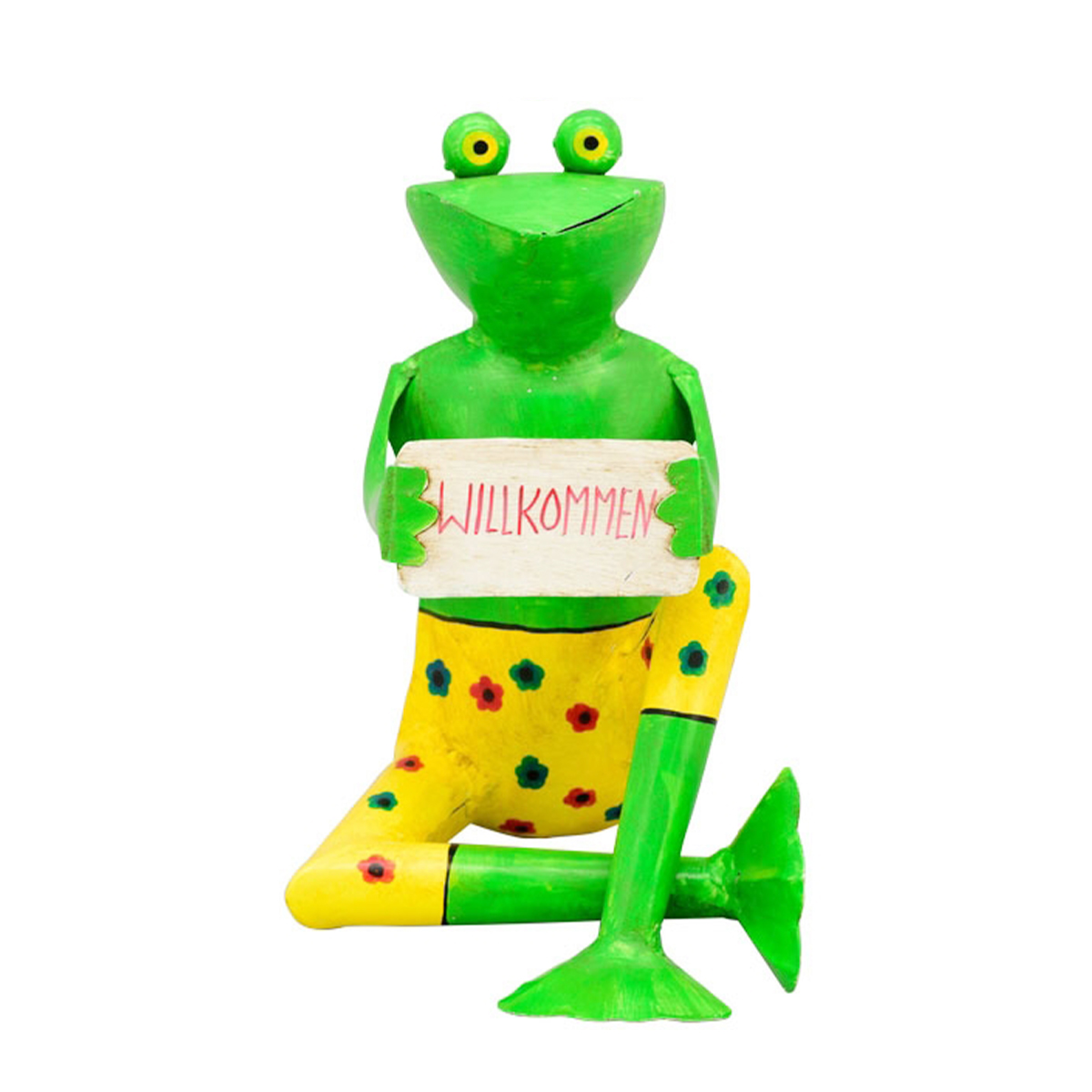 Deko Frosch Willkommen, Metallfrosch sitzend mit Blümchen-Badehose und Schild, 27cm