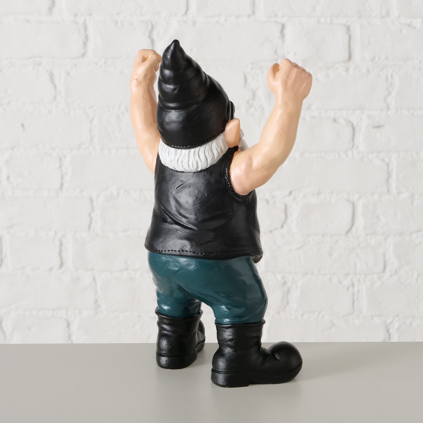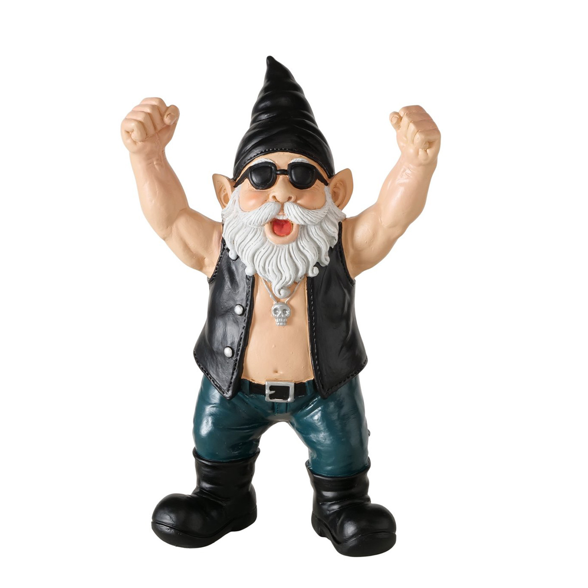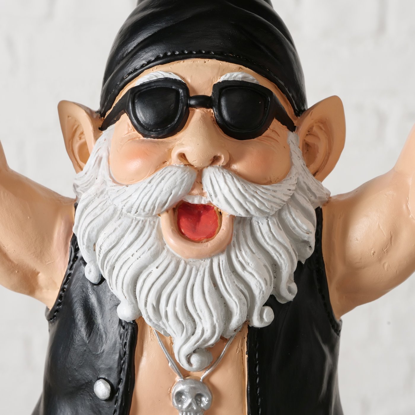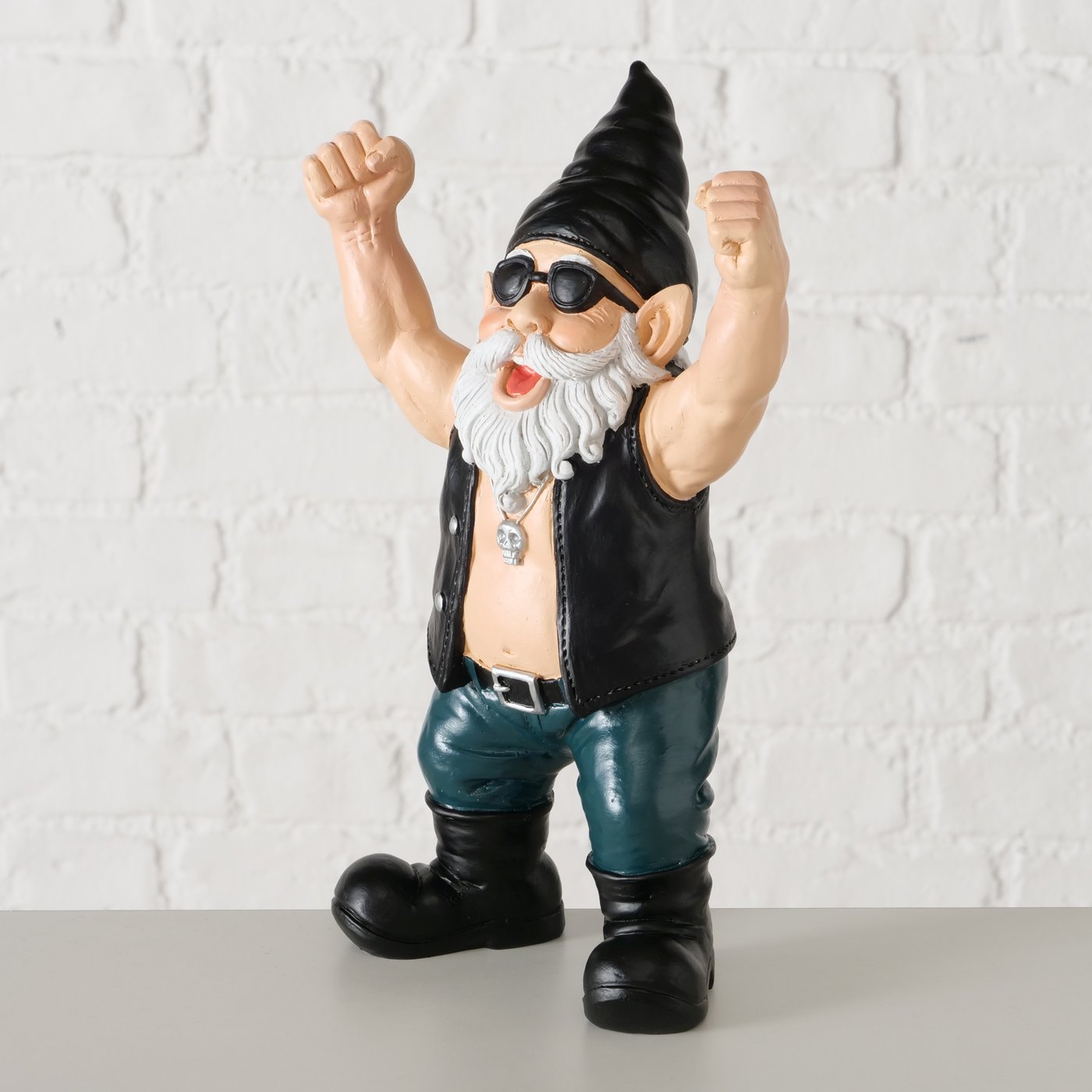 Mit Sonnenbrille, Lederweste und ordentlich Muskelpower bringt Wolfgang echtes Biker-Feeling in dein Zuhause. Seine jubelnde Pose macht sofort Stimmung und sorgt garantiert für ein Grinsen – egal ob im Regal, auf der Kommode oder als witziges Geschenk für echte Rockfans.