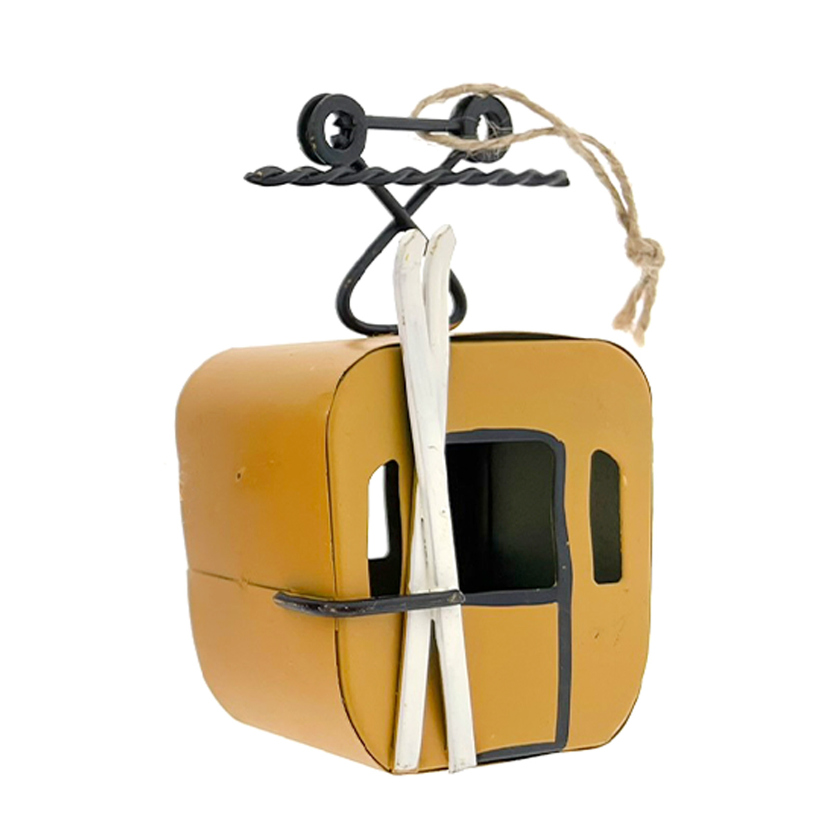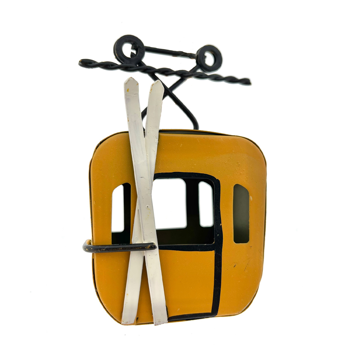 Deko Gondel gelb mit weißen Ski, Seilbahn, Skigondel aus Metall, 7x5x11cm, Hänger