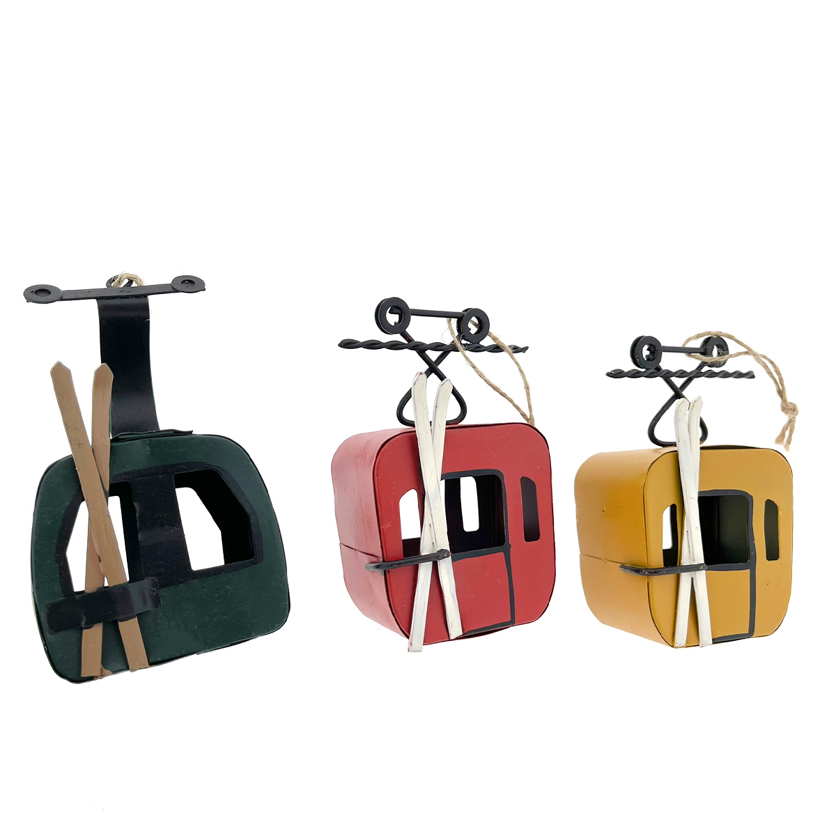 Deko Gondel rot mit weißen Ski, Seilbahn, Skigondel aus Metall, 7x5x11cm, Hänger