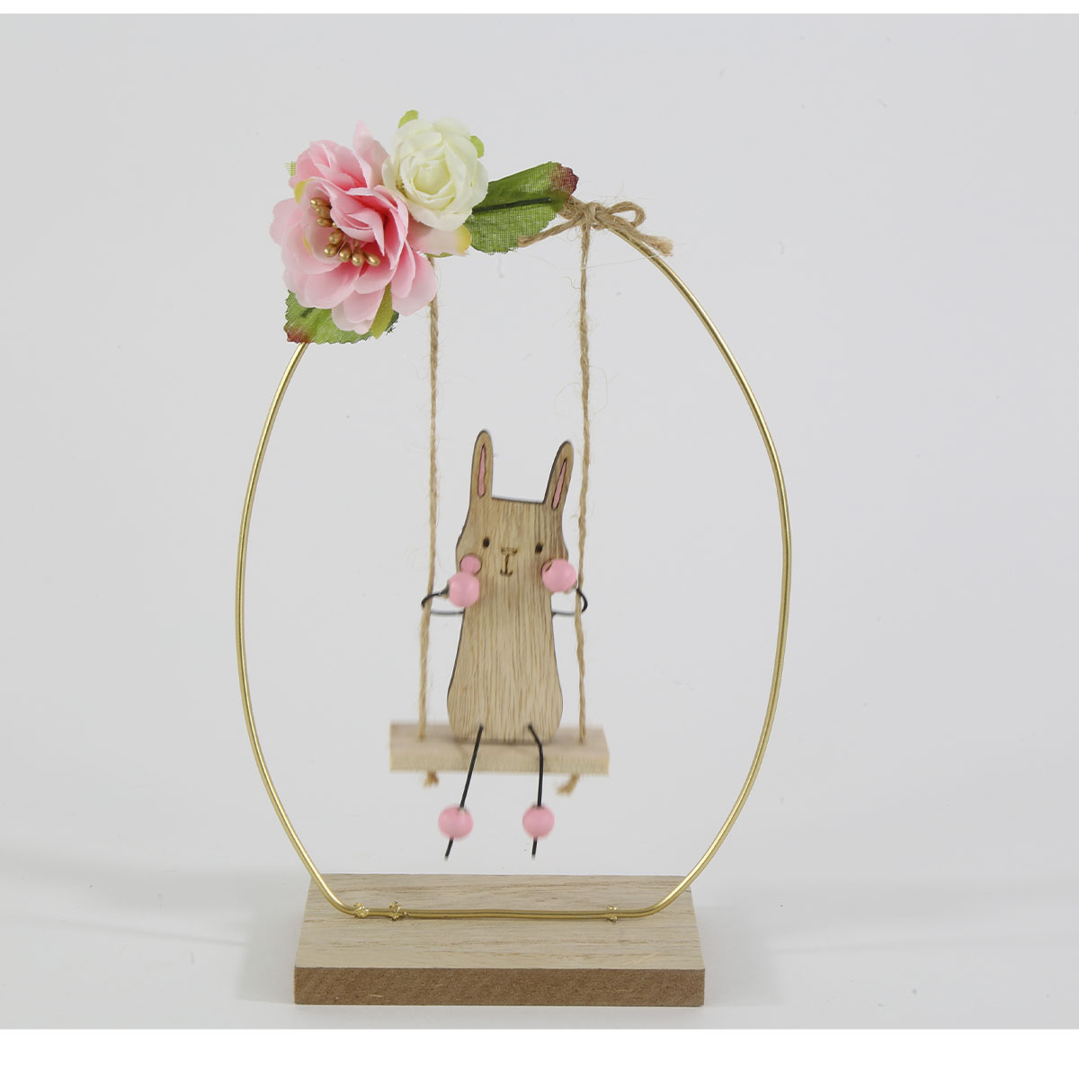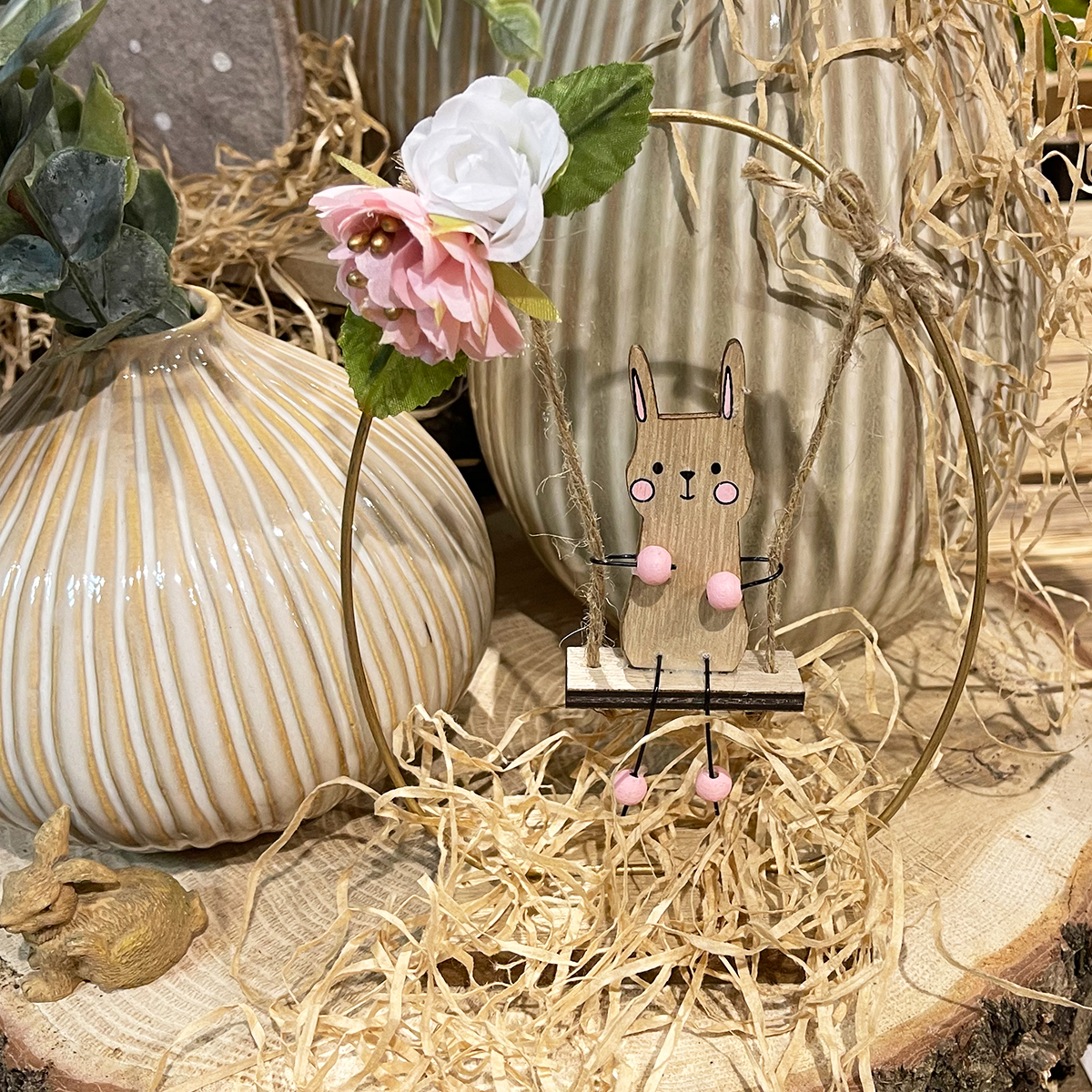 Deko Hase auf Schaukel, Holzhase Ostern auf Blumenschaukel, 19x13cm