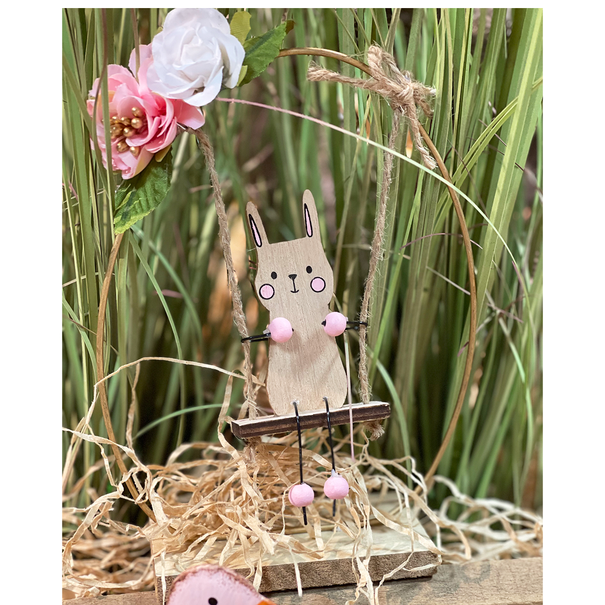 Produktinformationen "Deko Hase auf Schaukel, Holzhase Ostern auf Blumenschaukel, 19x13cm"
