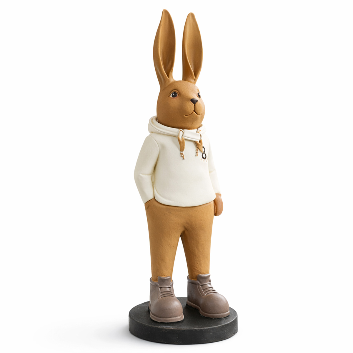 Mit seinem Hoody, den großen Hasenohren und dem ruhigen Gesichtsausdruck wirkt er fast so, als würde er gerade einen gemütlichen Spaziergang durch den Garten machen. Er verbindet Osterdeko mit einem Hauch Alltag und sorgt genau dadurch für Wärme, Charme und ein entspanntes Zuhausegefühl.