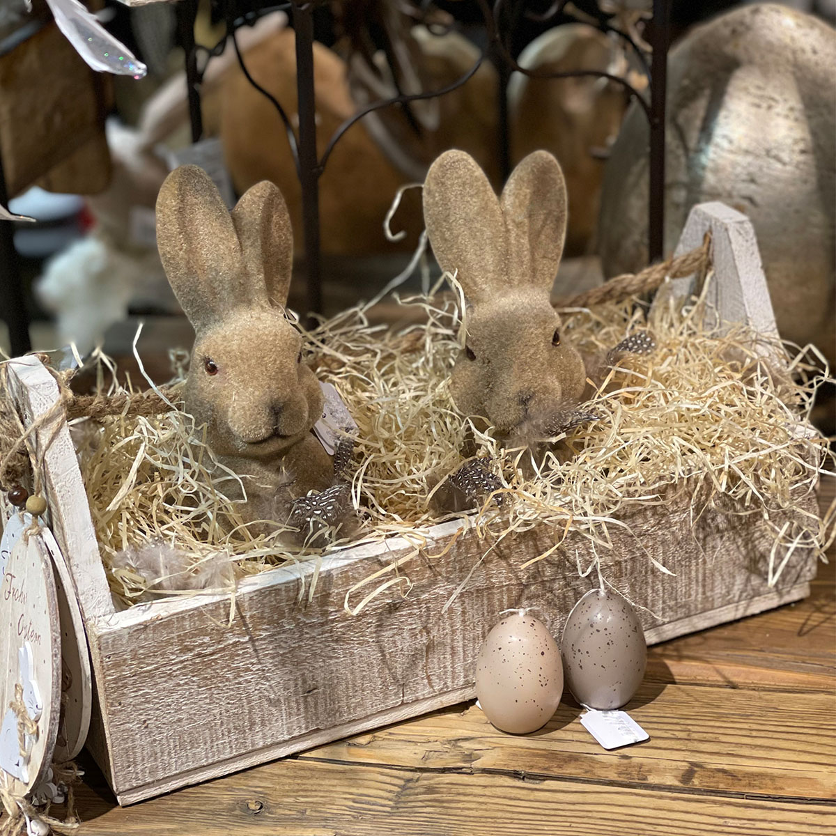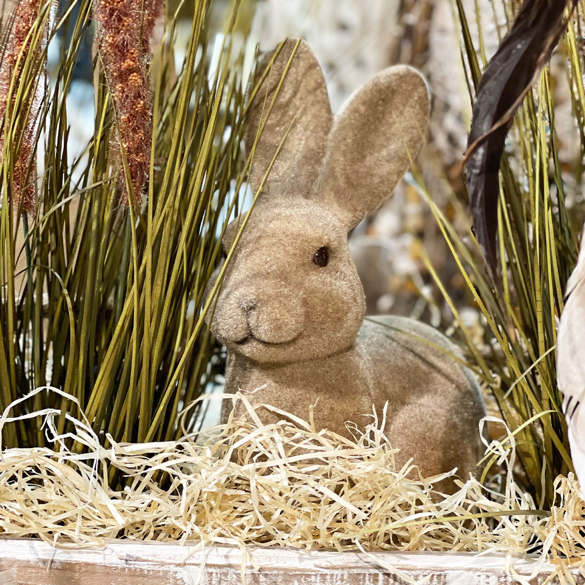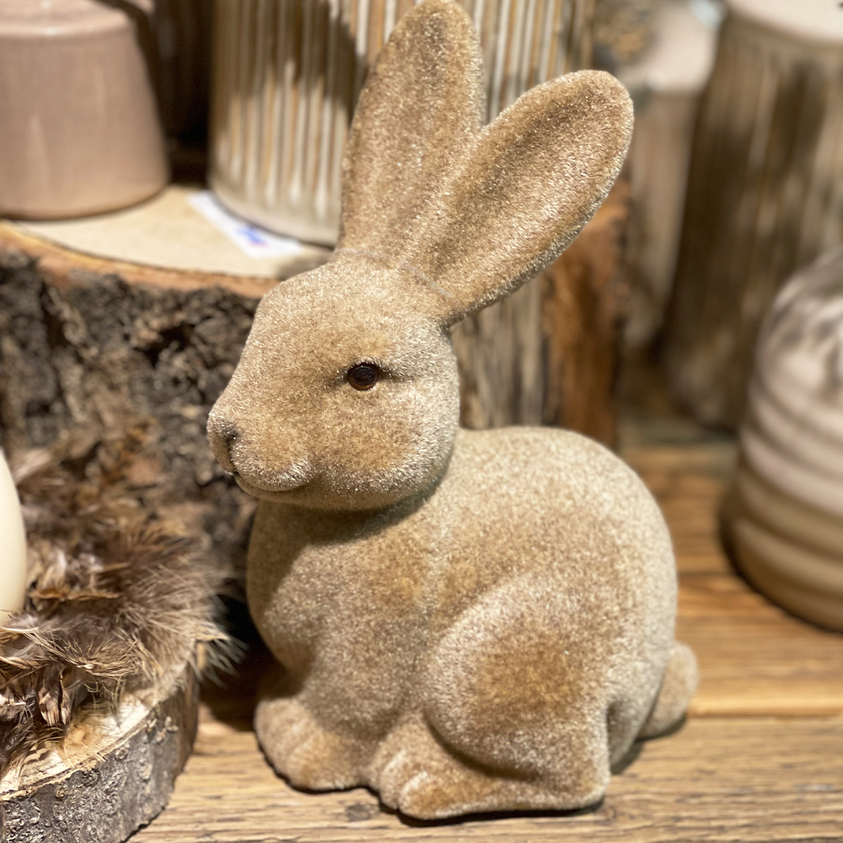 Deko Hase sitzend, Osterhase braun beflockt, 14x23cm, Kunststoff