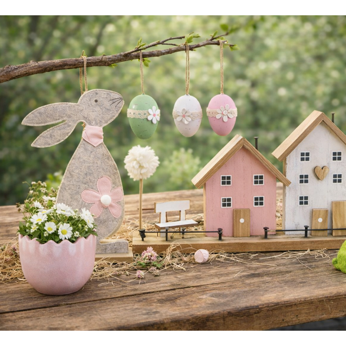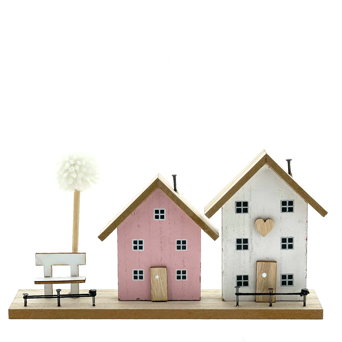 Produktinformationen "Deko Haus Häuserzeile, Holzhäuser mit Bank und Baum, rosa-weiß, Aufsteller"