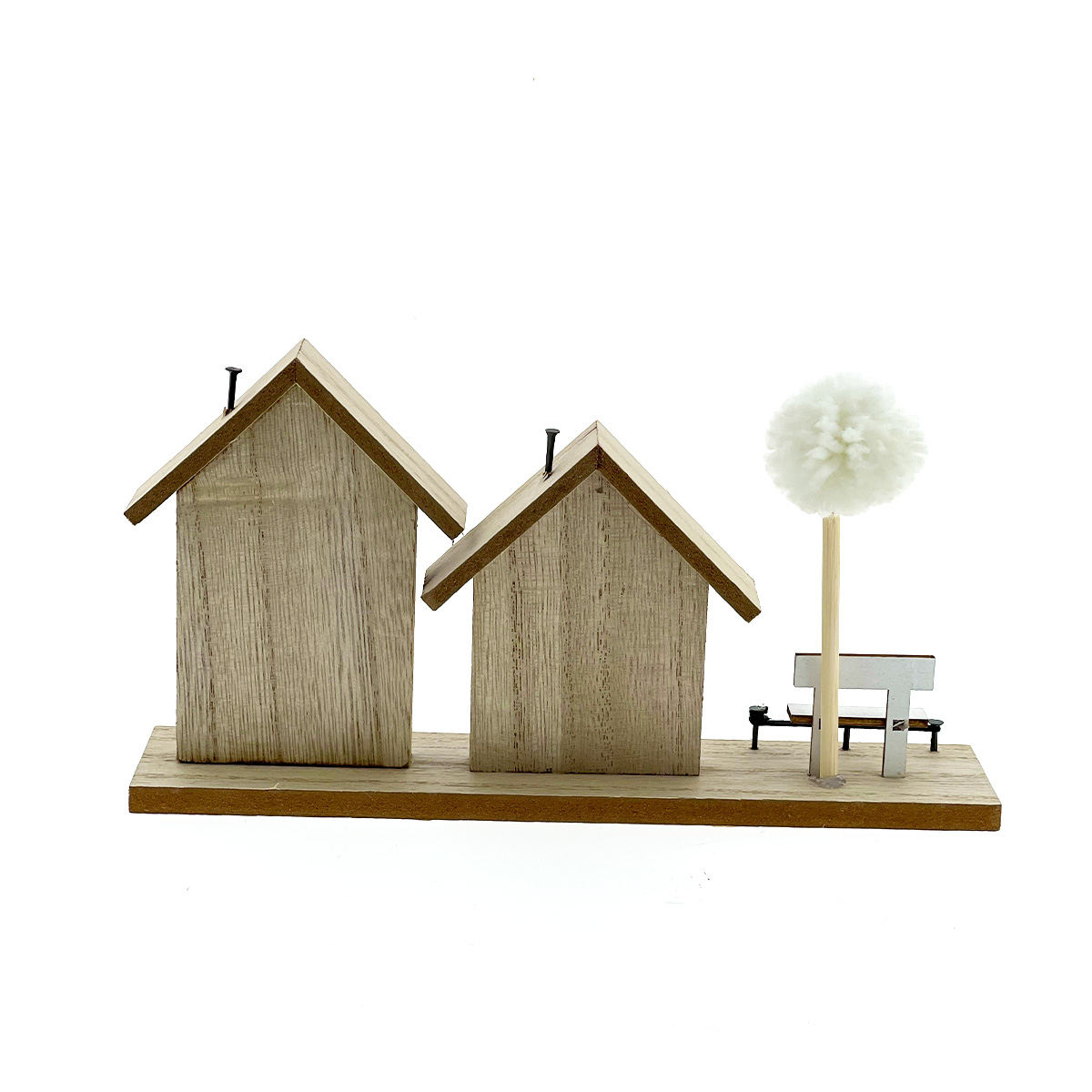 Deko Haus Häuserzeile, Holzhäuser mit Bank und Baum, rosa-weiß, Aufsteller