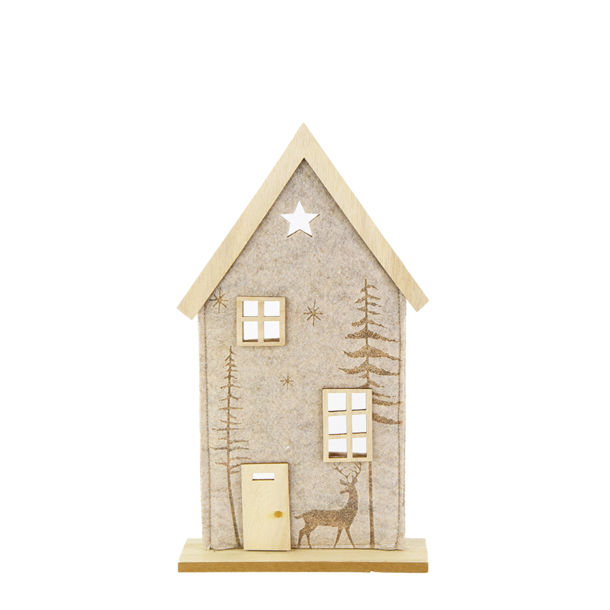 Deko Haus Hirsch, Filzhaus mit Bäume und Hirsch, beige-braun, 11x22cm, Aufsteller