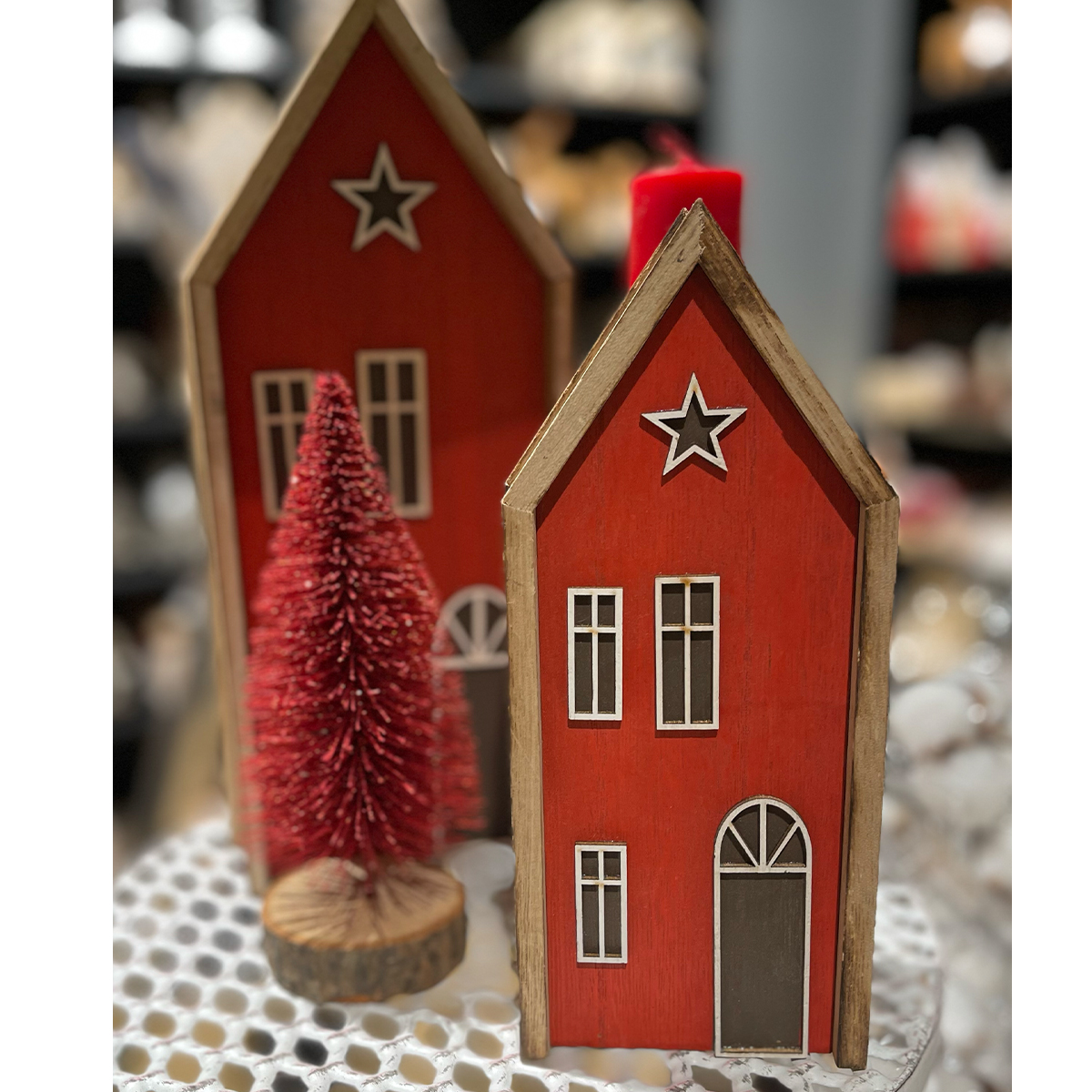 Deko Haus, Weihnachtshaus, Holzhaus mit Stern, rot-natur, 13x31cm, Aufsteller
