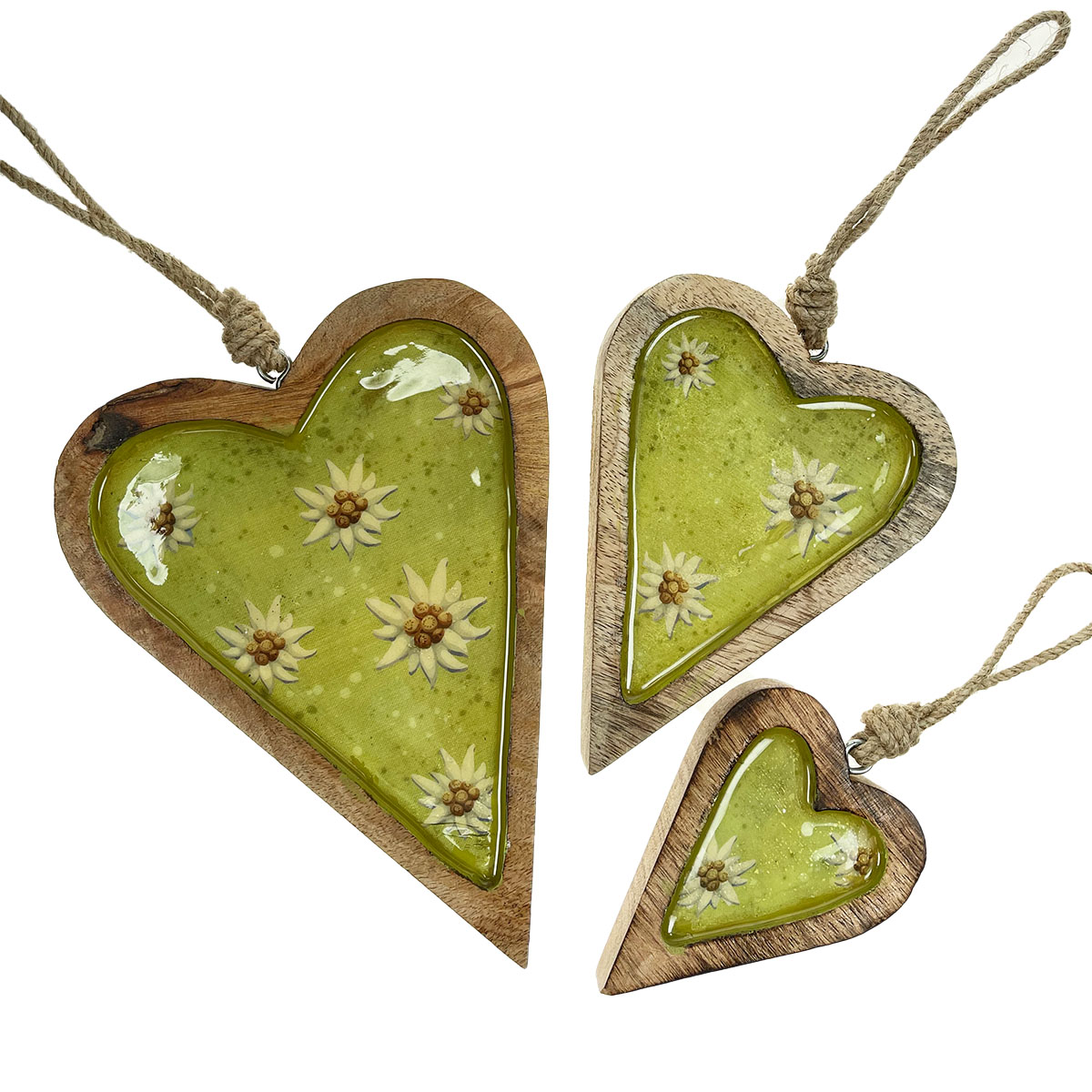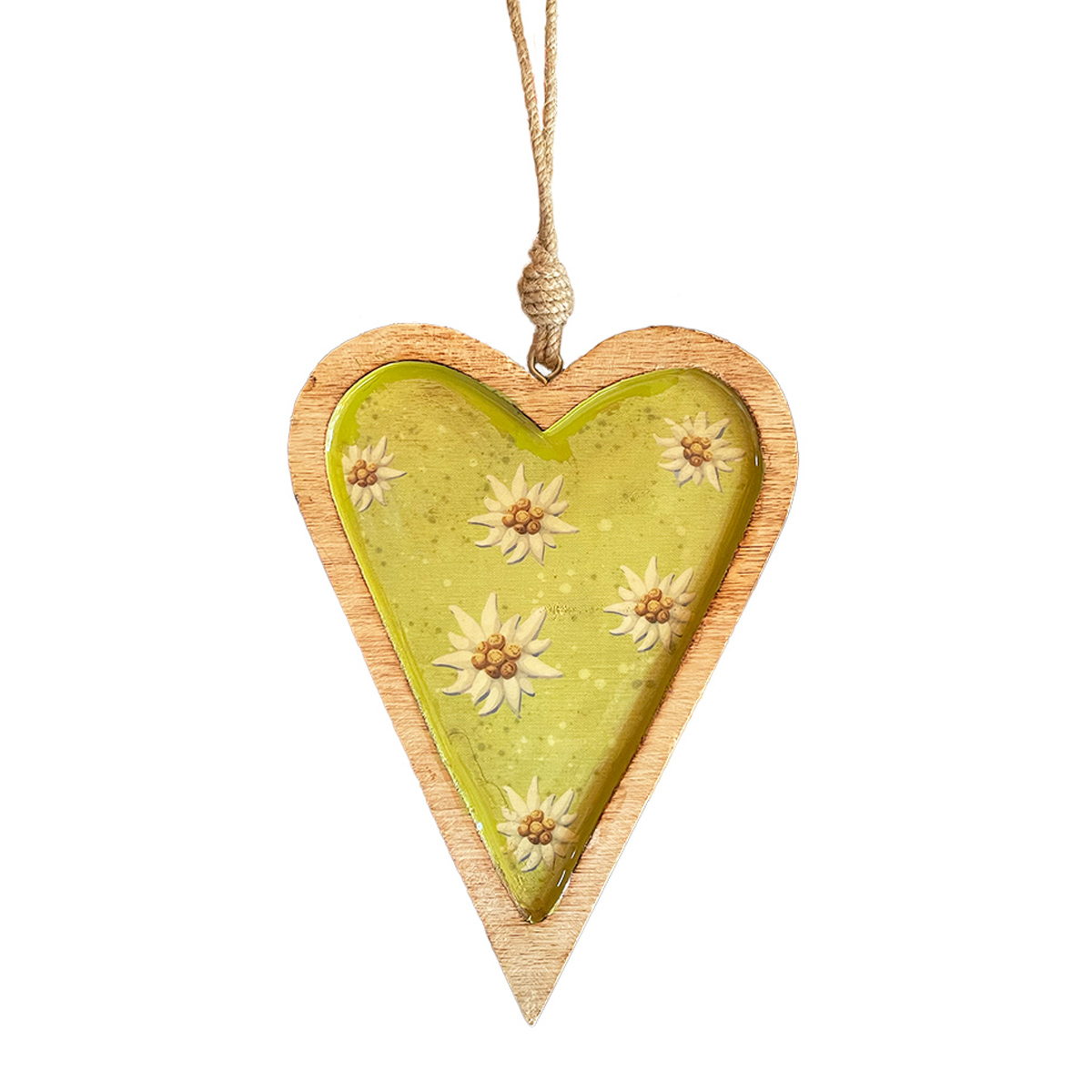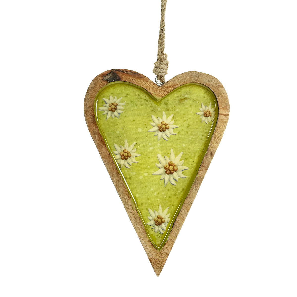 Deko Herz Landhaus, Holzherz hellgrün mit Edelweiß, Emailleoptik, 14x19cm, Hänger