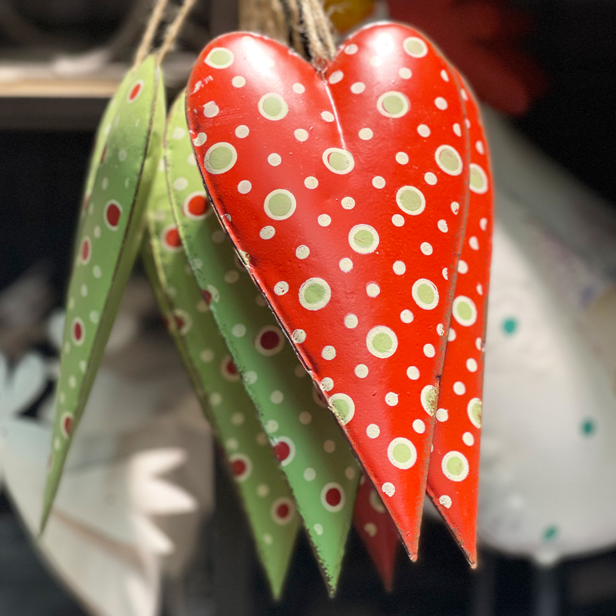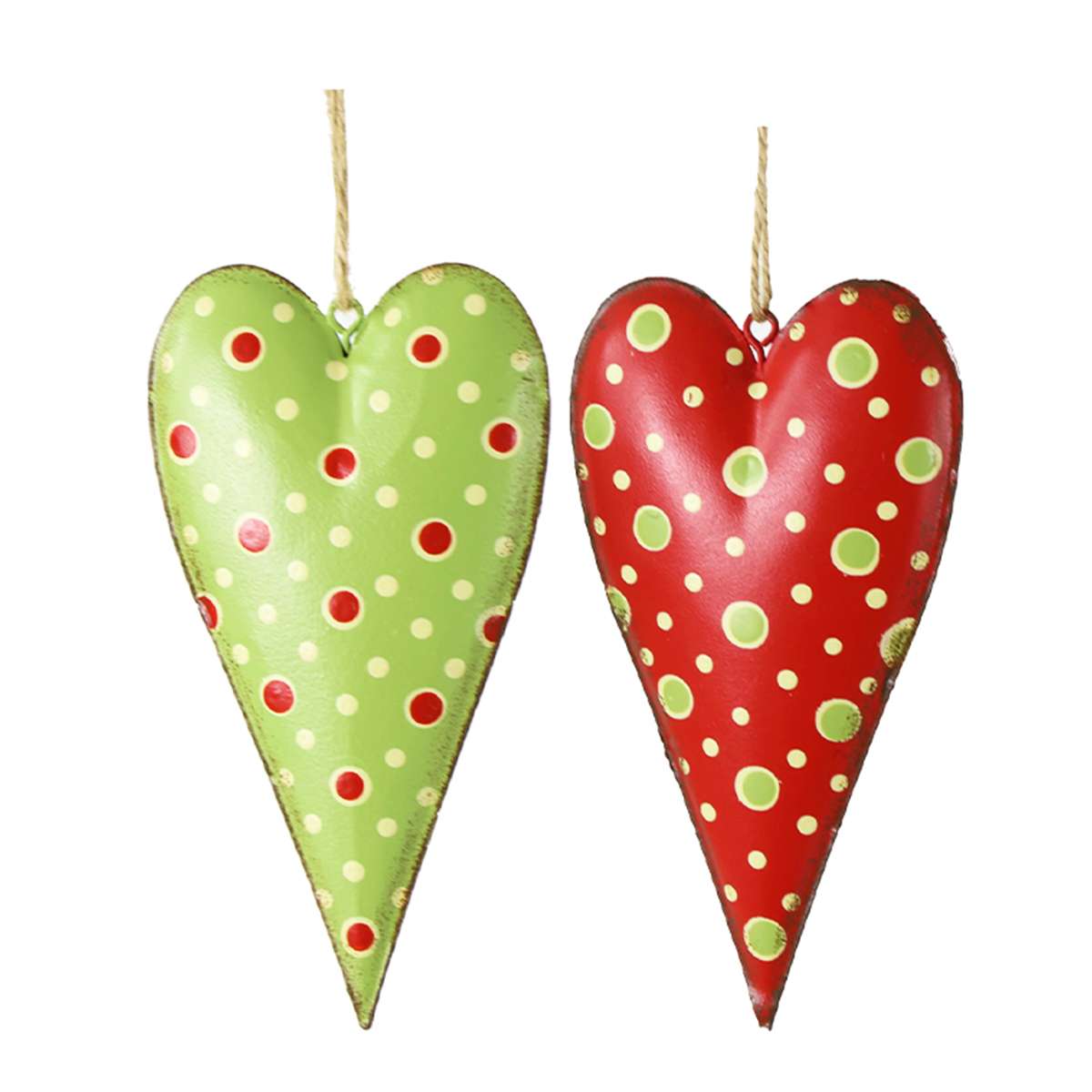 Deko Herz, Metallherz mit Punkte, rot und grün, 14cm, Hänger, Set/2