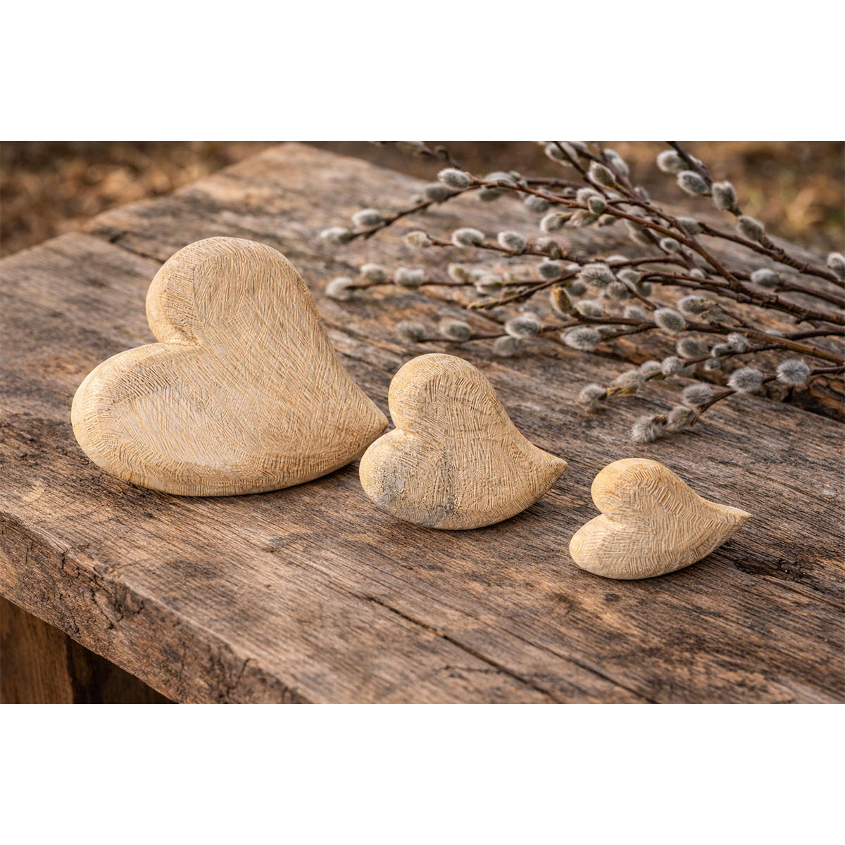 Die sanft gerundete Form wirkt weich und harmonisch, während die bewusst grobe, sägeraue Oberfläche dem Herz seinen ursprünglichen Charakter verleiht. Maserung, kleine Kerben und Unregelmäßigkeiten machen jedes Stück zu einem Unikat.