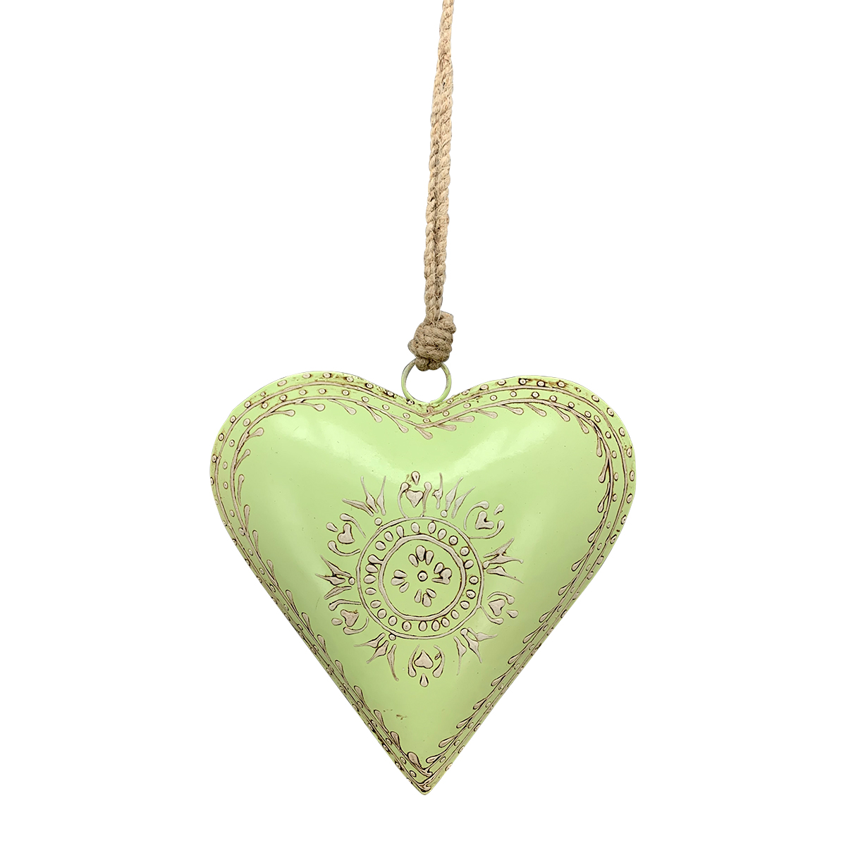 Dieses kleine Deko-Herz aus Metall fügt sich harmonisch in die Serie der nostalgischen Herzen ein und überzeugt mit derselben eleganten Ausstrahlung. Das fein gearbeitete Ornamentmuster im Vintage-Stil verleiht dem Herz eine ruhige, zeitlose Wirkung und macht es zu einem liebevollen Detail für jede Landhausdekoration.