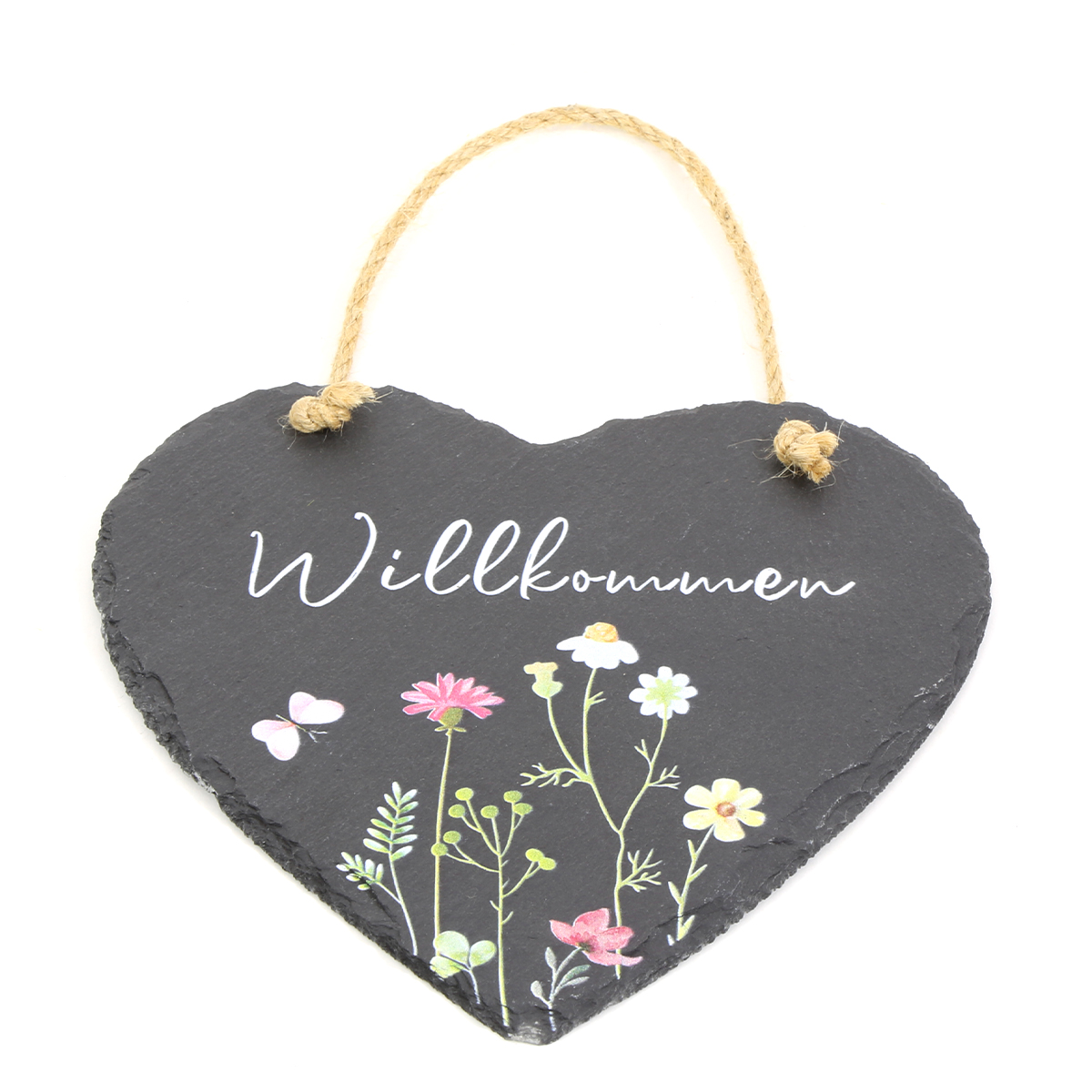 Deko Herz Willkommen, Schieferherz mit Blumen und Schmetterling, 20x20cm