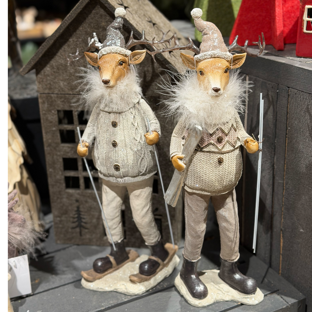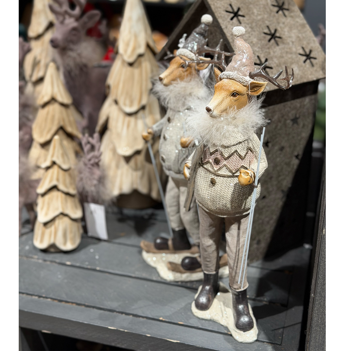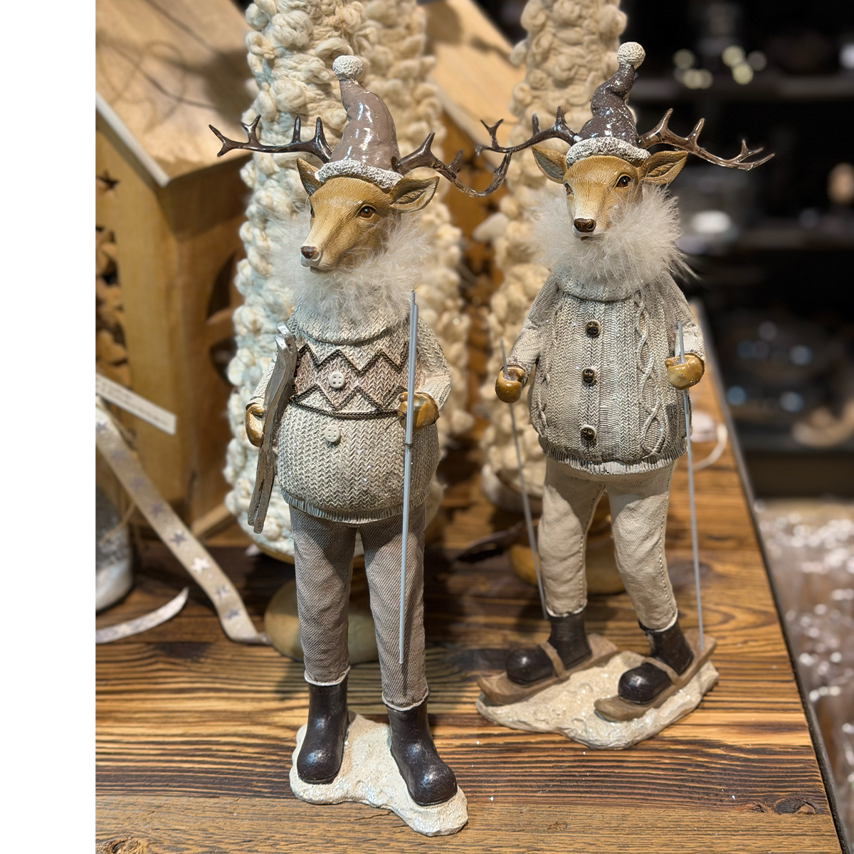 Besonders schön: Dieser Skihirsch hat einen Partner im gleichen Stil, der die Ski noch locker unter dem Arm trägt. Zusammen erzählen die beiden eine kleine Wintergeschichte und sind als Duo ein echter Blickfang für alle, die alpine Deko mit Humor und Herz lieben.