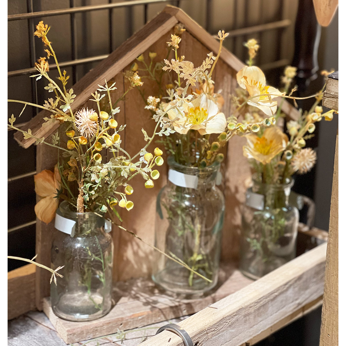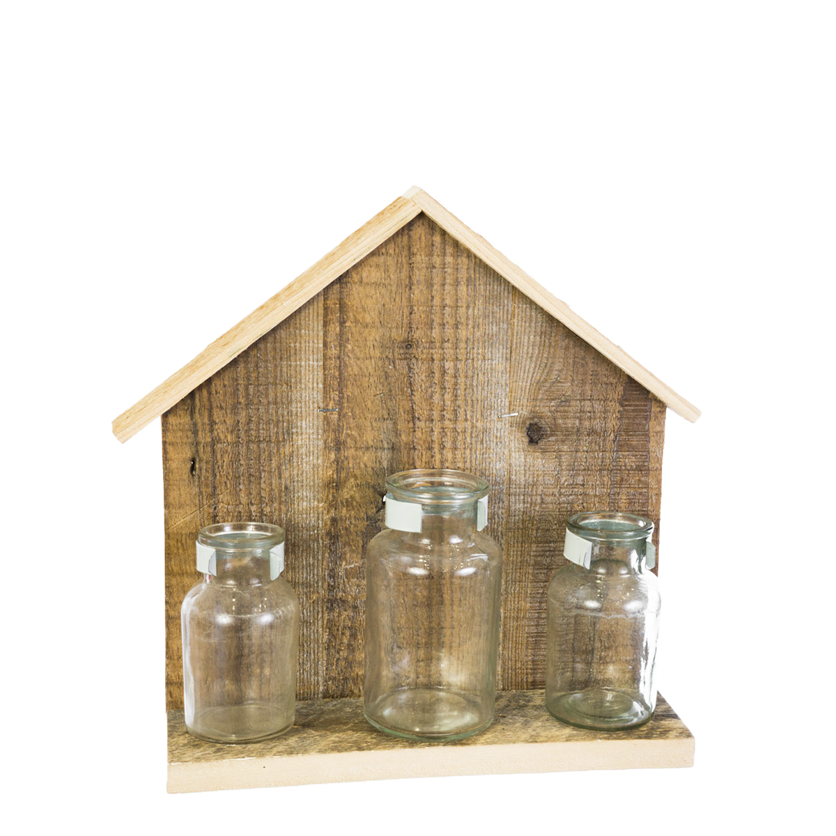 Deko Holzhaus Flaschentrio, Holzhaus Naturholz mit 3 Blumenvasen