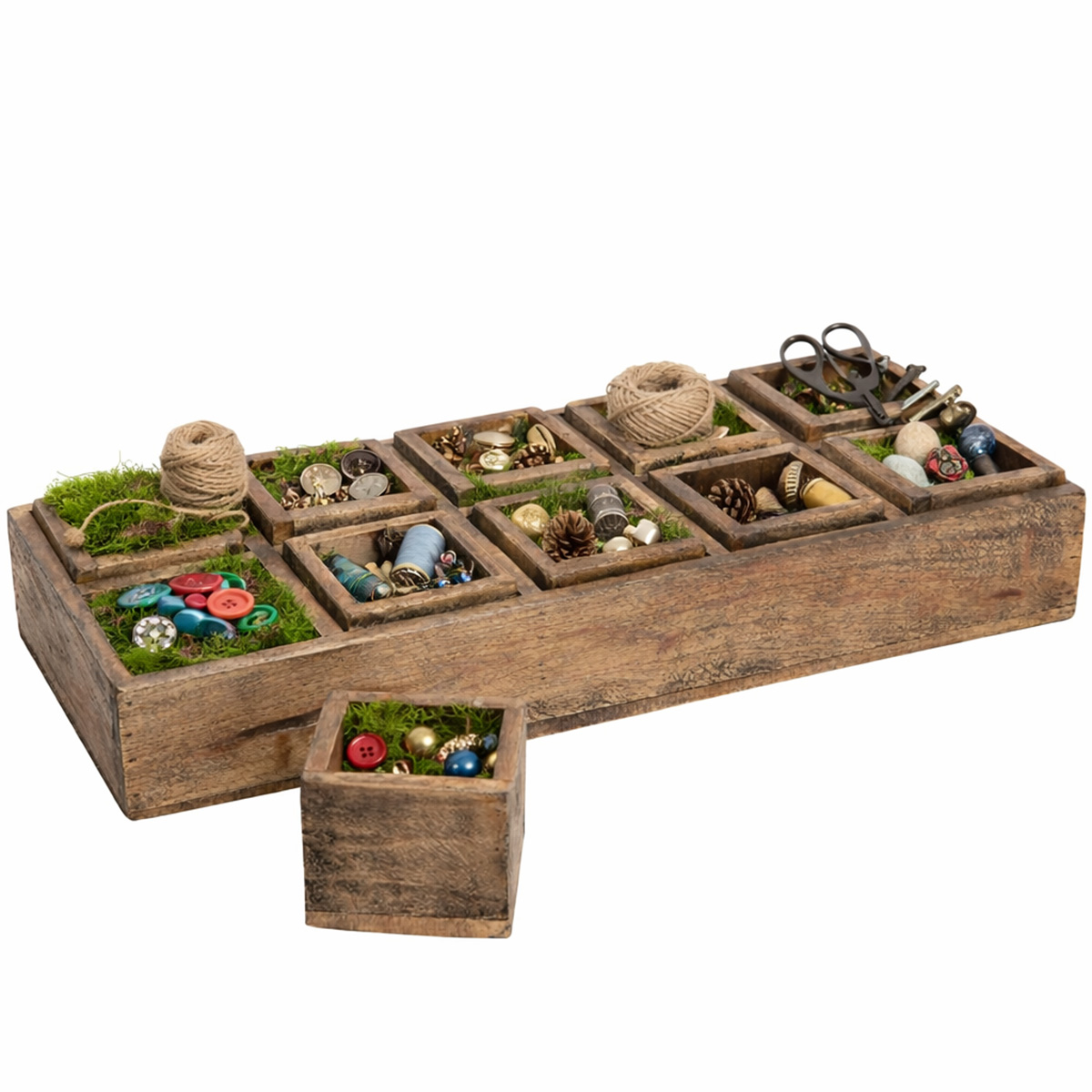 Die massive Kiste im used look bringt mit ihren zehn kleinen, herausnehmbaren Holzboxen sofort gemütliches Landhausgefühl ins Zuhause und lädt zum Dekorieren, Sortieren und Kreativsein ein.