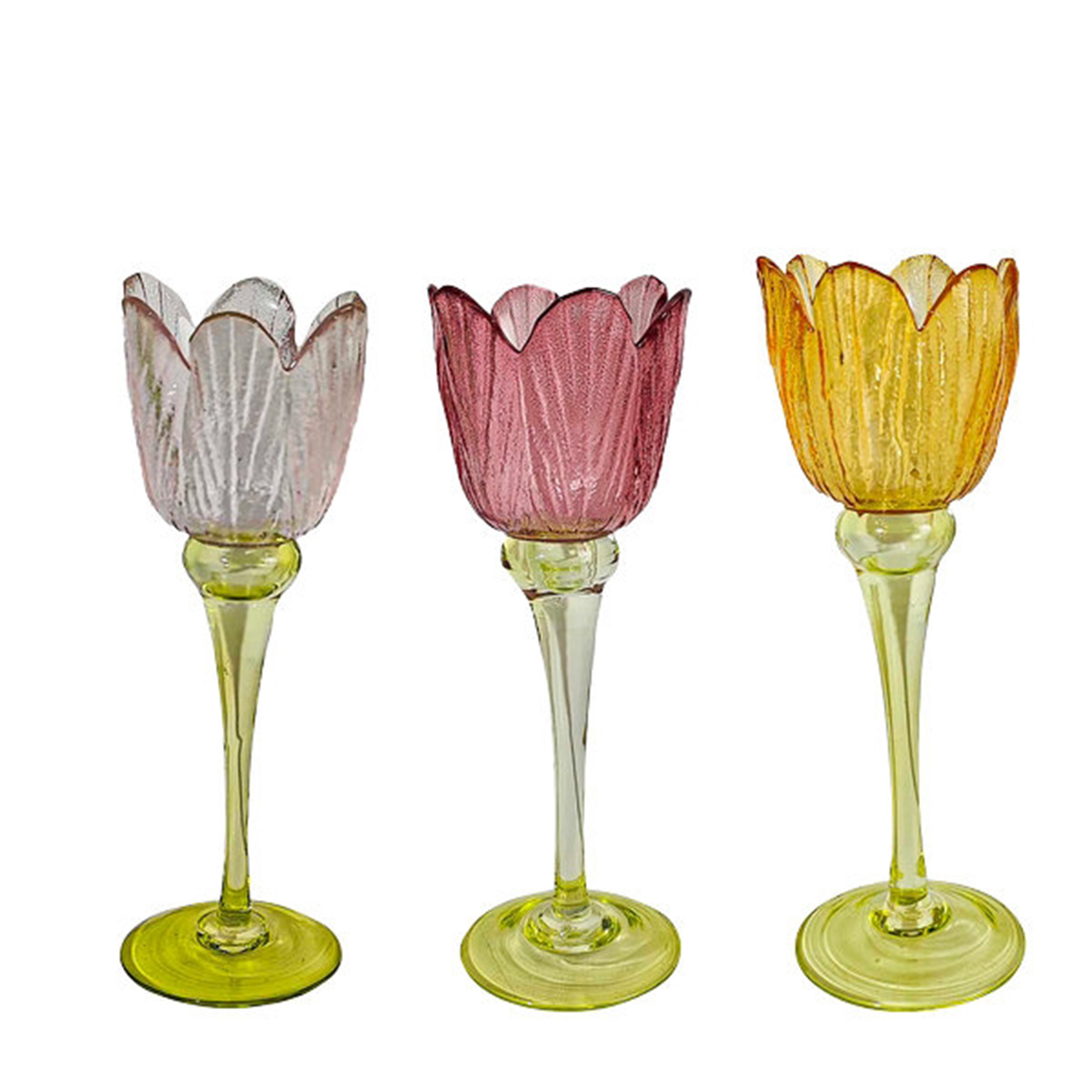 Das fein strukturierte Glas erinnert an eine geöffnete Blüte, während der schlanke Stiel und der farblich abgesetzte Fuß dem Design eine besonders stilvolle, leicht verspielte Note verleihen. Ob auf dem gedeckten Tisch, auf der Fensterbank oder als Teil eines dekorativen Arrangements – dieses Tulpenglas setzt sanfte Lichtakzente und wirkt sowohl einzeln als auch in Kombination mit den weiteren Tulpengläsern in unterschiedlichen Farben und Formen besonders harmonisch.