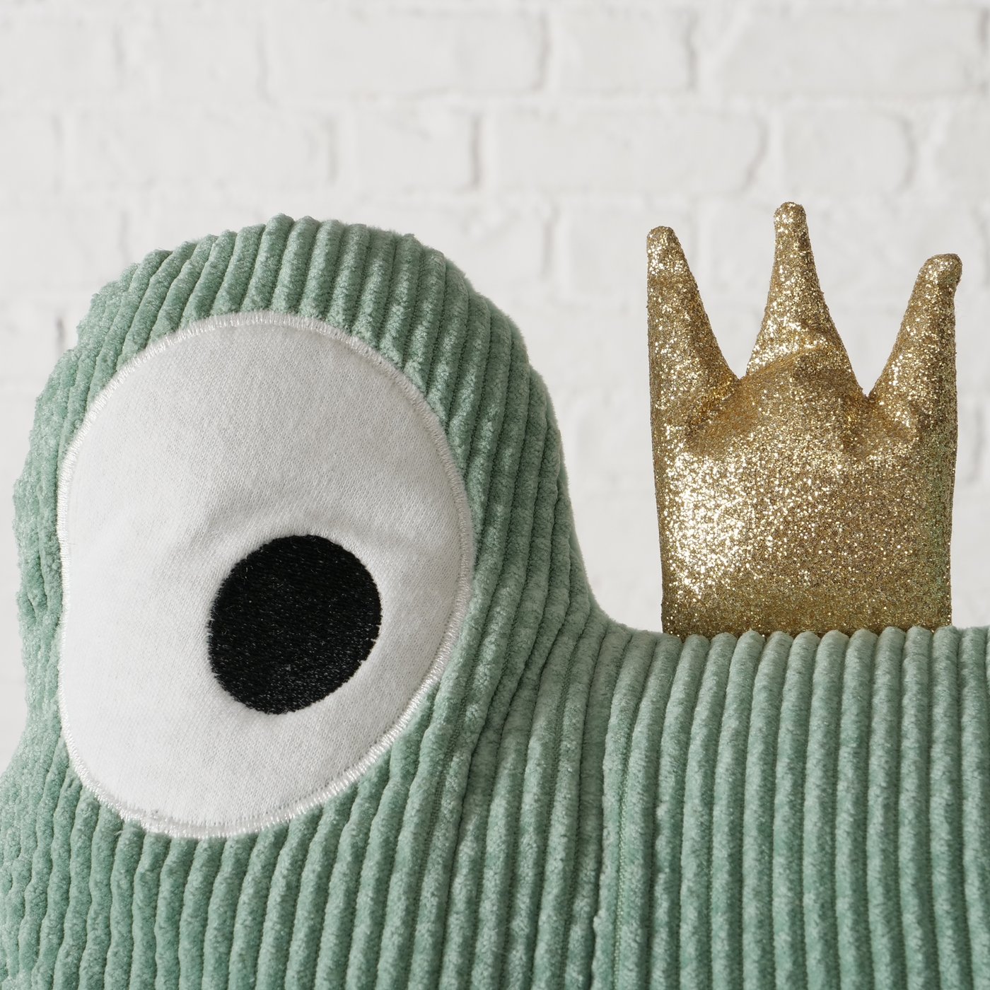 Mit seinen großen Augen, dem breiten Lächeln und der kleinen goldenen Krone sieht Froggy aus wie ein echter Froschkönig, der sein Reich am liebsten im Kinderzimmer, auf dem Sofa oder im Bett errichtet.