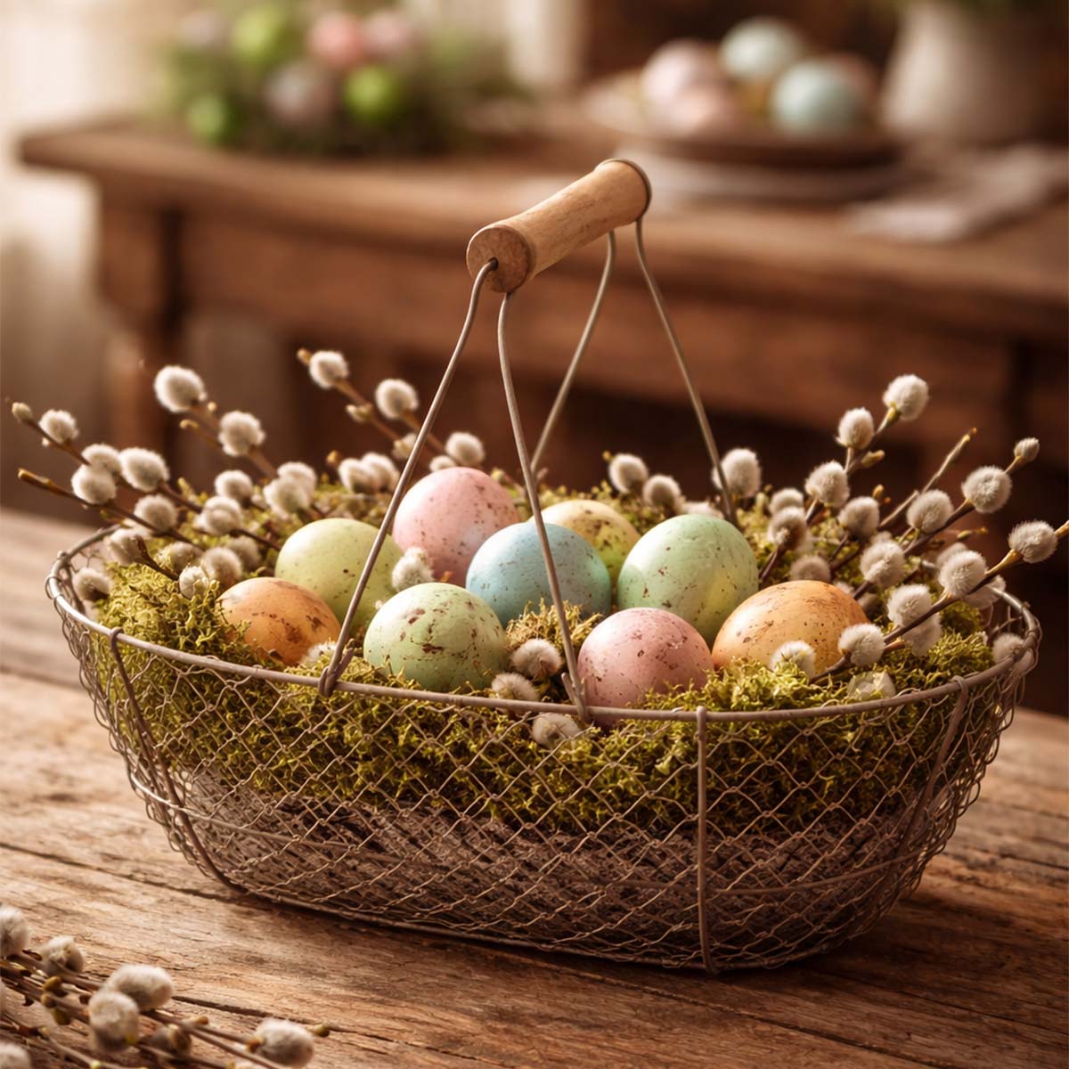 Dieser dekorative Drahtkorb im rustikalen Used-Look verbindet praktische Funktionalität mit natürlichem Landhauscharme.