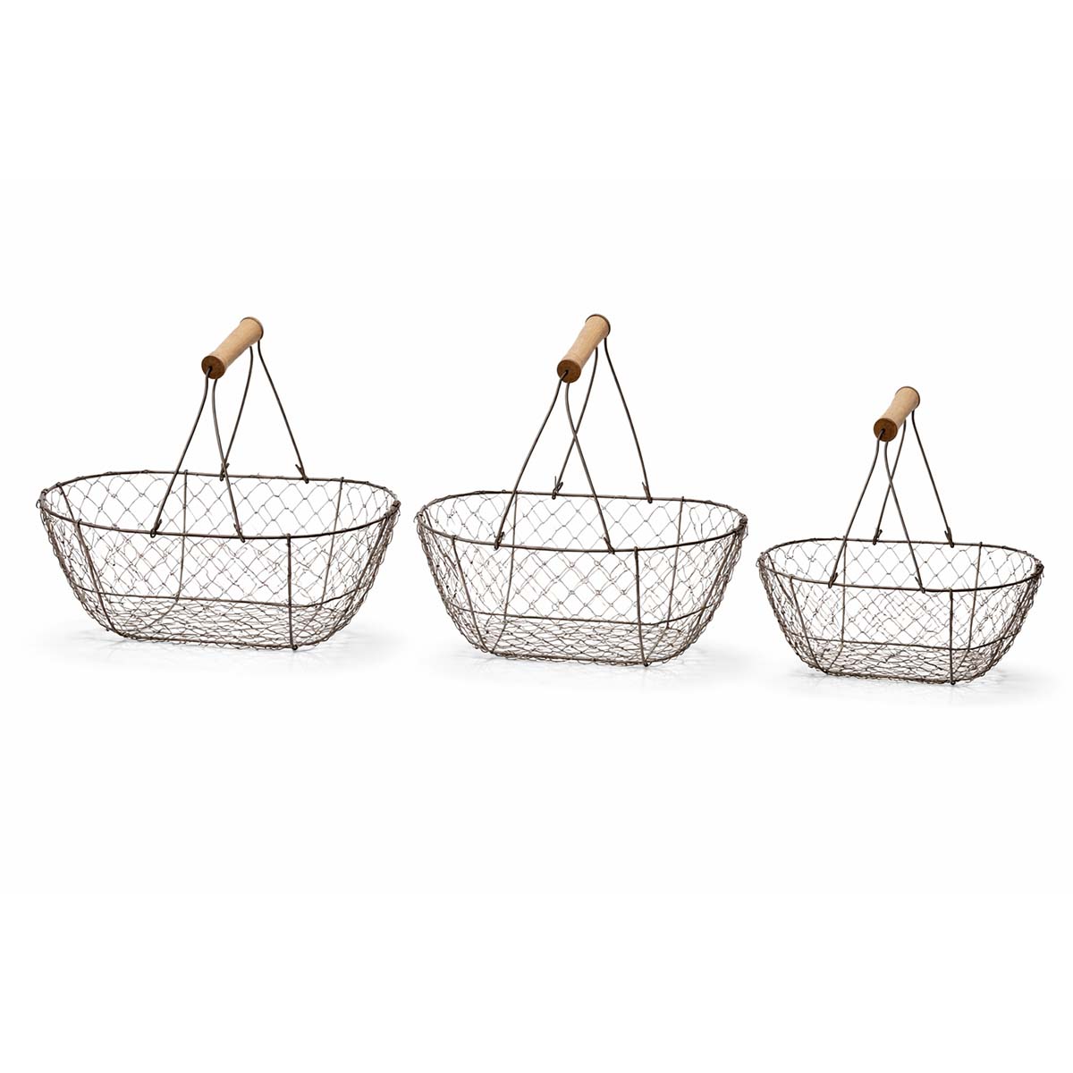 Die offene Drahtstruktur aus Metall mit dezentem Rostfinish verleiht dem Korb eine authentische, leicht vintageartige Ausstrahlung und macht ihn zu einem vielseitigen Wohnaccessoire für Küche, Wohnzimmer, Terrasse oder Garten. Der stabile Bügelgriff mit Holzgriff sorgt für ein angenehmes Tragen und unterstreicht gleichzeitig die warme, natürliche Optik.