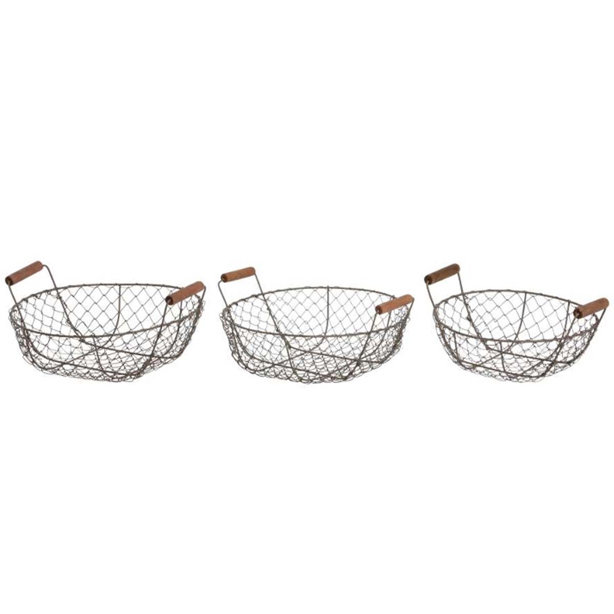 Die offene Drahtstruktur aus Metall mit dezentem Rostfinish verleiht dem Korb eine authentische, leicht vintageartige Ausstrahlung und macht ihn zu einem vielseitigen Wohnaccessoire für Küche, Wohnzimmer, Terrasse oder Garten. Der stabile Bügelgriff mit Holzgriff sorgt für ein angenehmes Tragen und unterstreicht gleichzeitig die warme, natürliche Optik.
