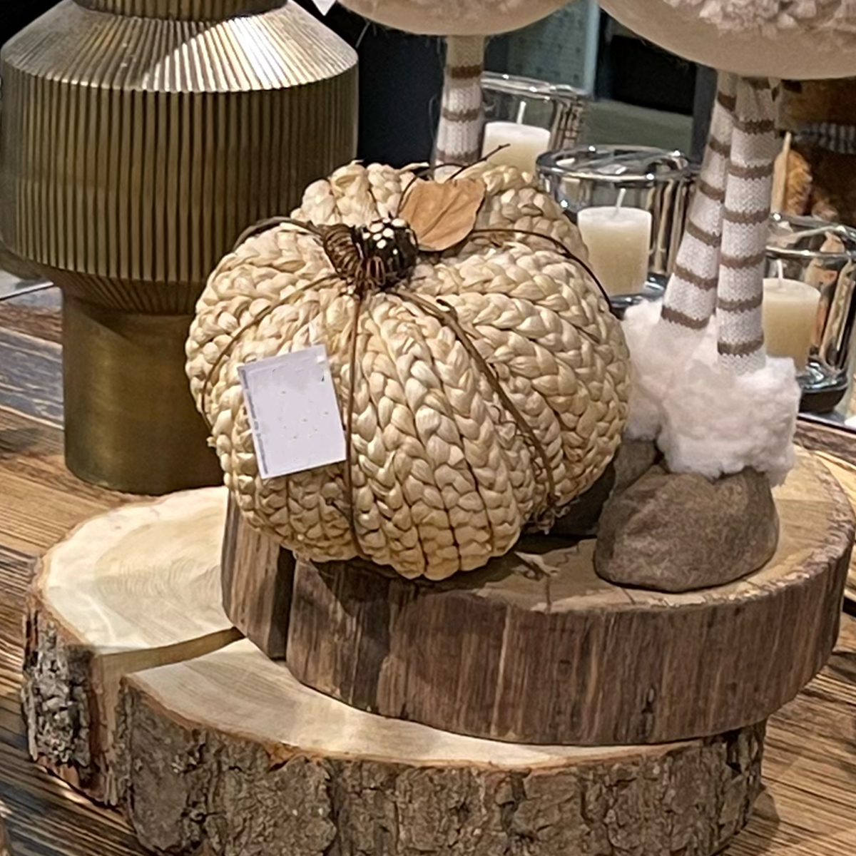 Produktinformationen "Deko Kürbis, Kürbis aus Maisstroh geflochten, mit Holzstil und Blatt, 17cm"