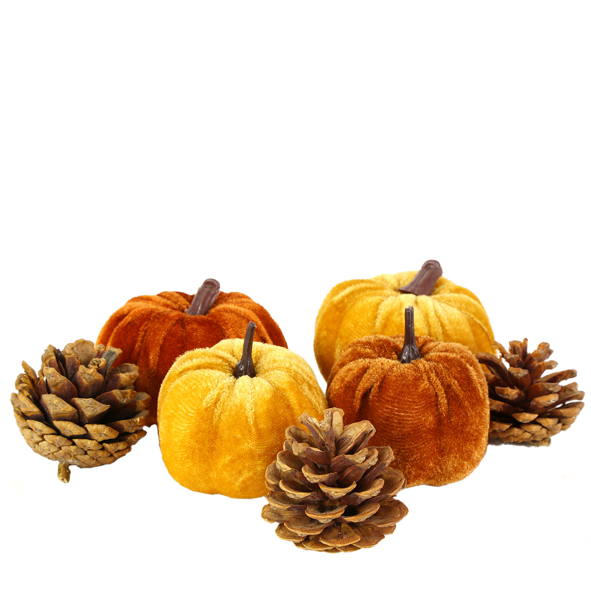 Deko Kürbis, Samtkürbisse und Zapfen, orange/braunorange, 16St/Netz