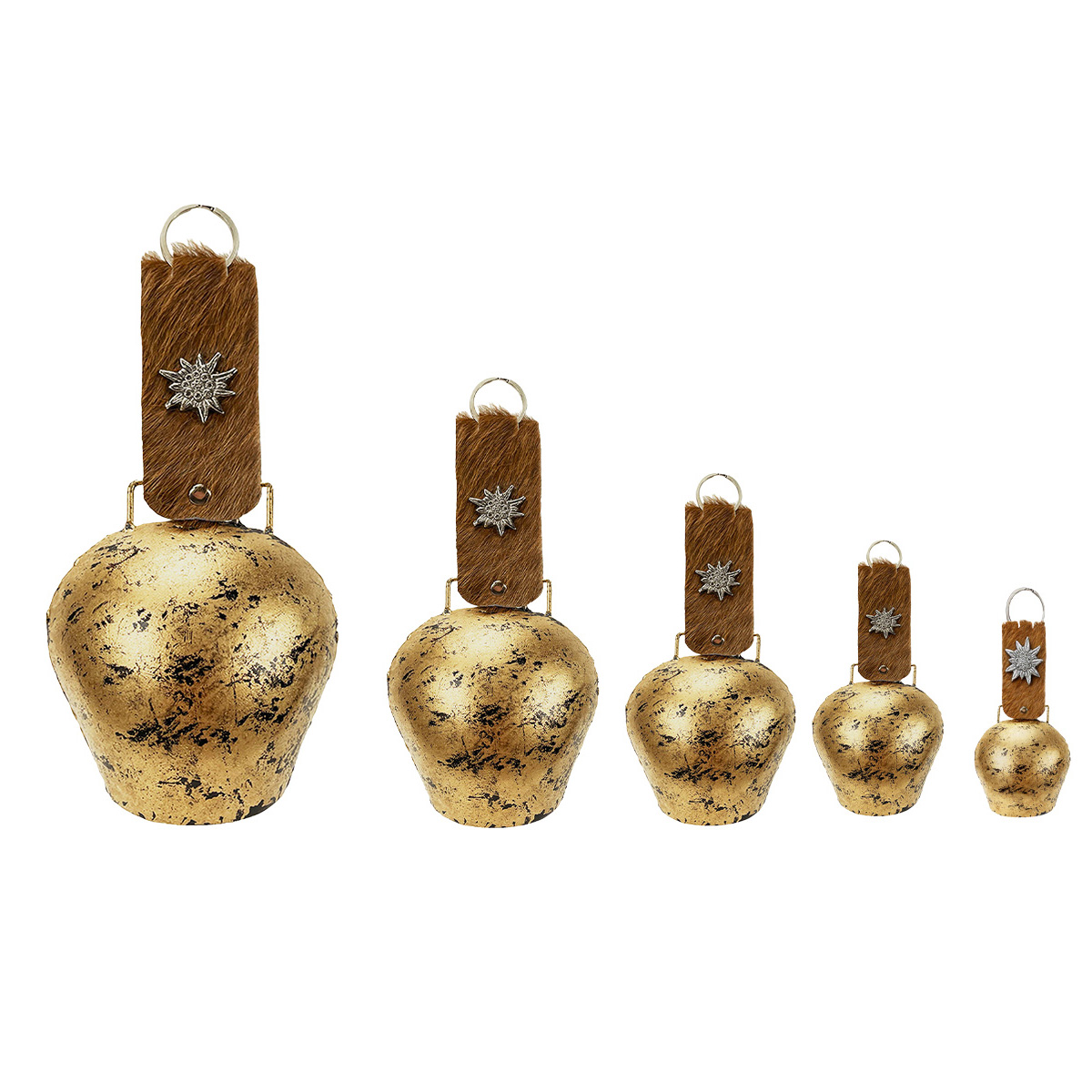 Deko Kuh-Glocke antik gold mit Fellband und Edelweiß, rustikale Glocke mit Klang, 3cm