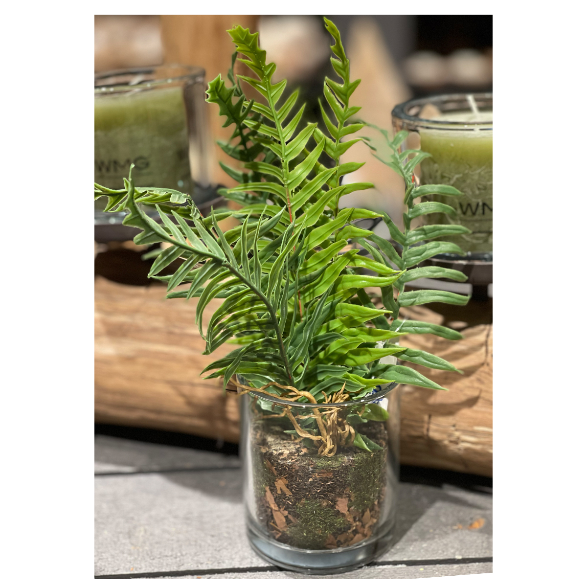 Deko Kunstpflanze Farn, Farn mit Erdballen im Glas, Farn wie echt