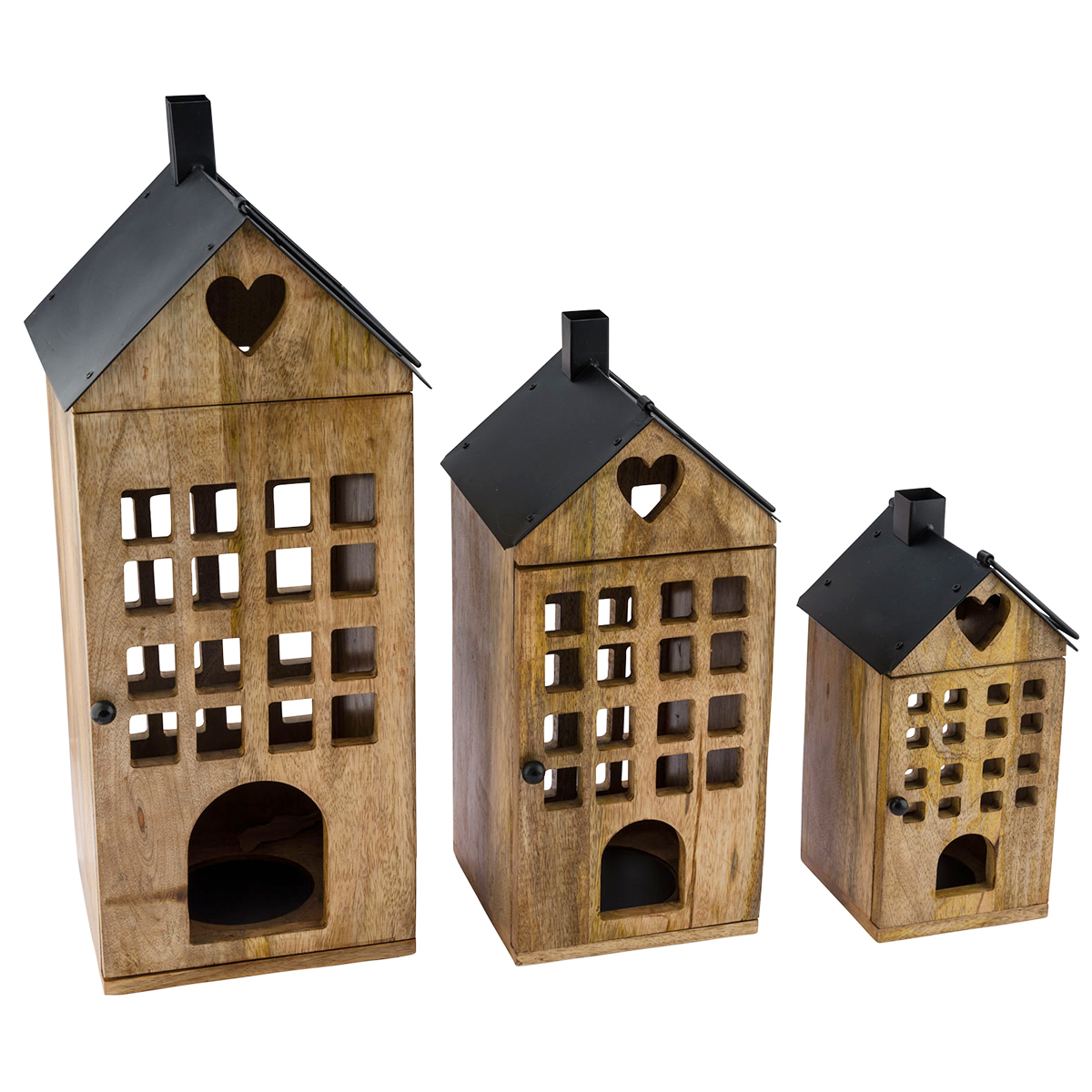 Deko Laterne Haus, Holzlaterne mit vielen Fenstern, schwarzes Metalldach, 42cm