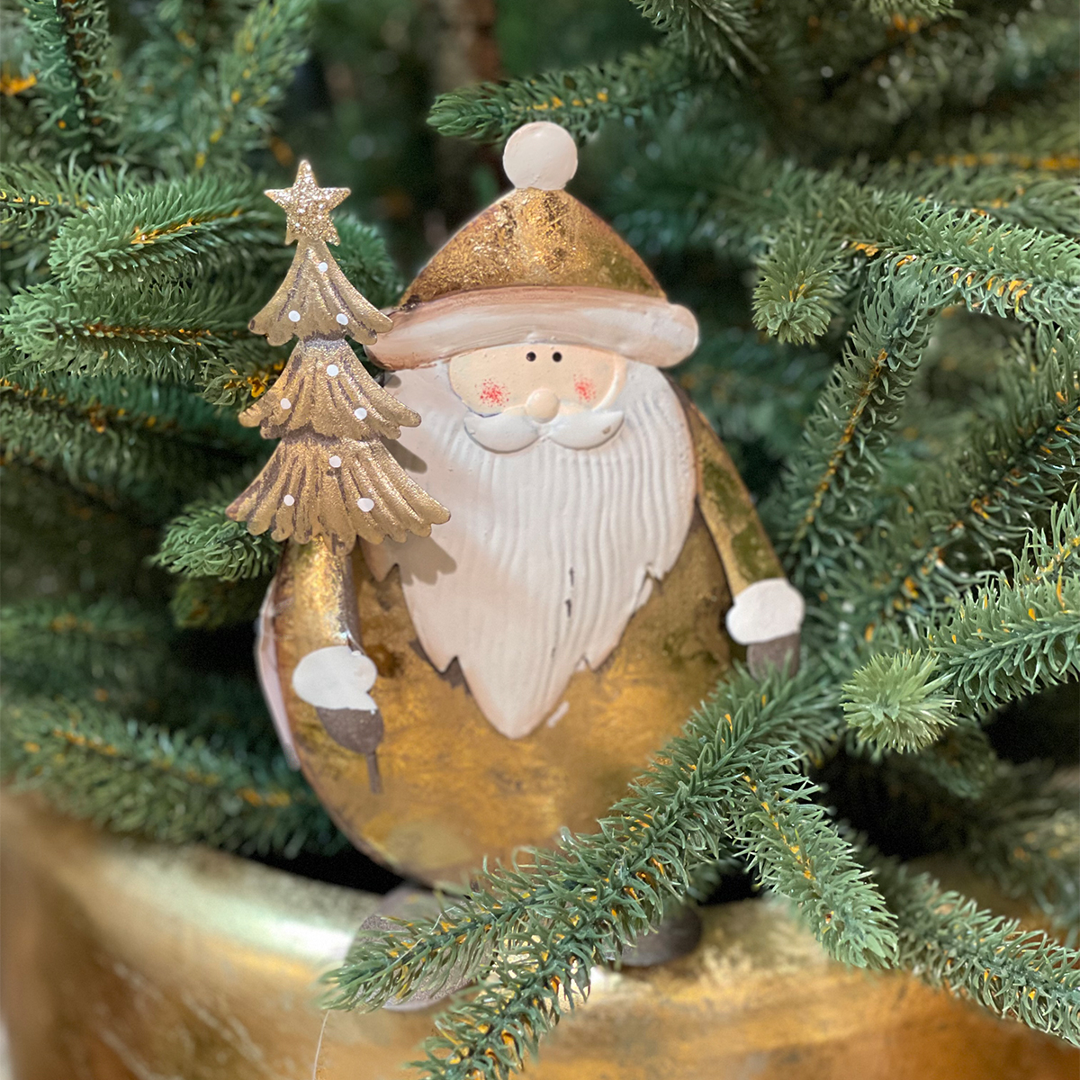 Deko Nikolaus mit Tannenbaum, Weihnachtsmann antik gold - used look, 13cm, Metall