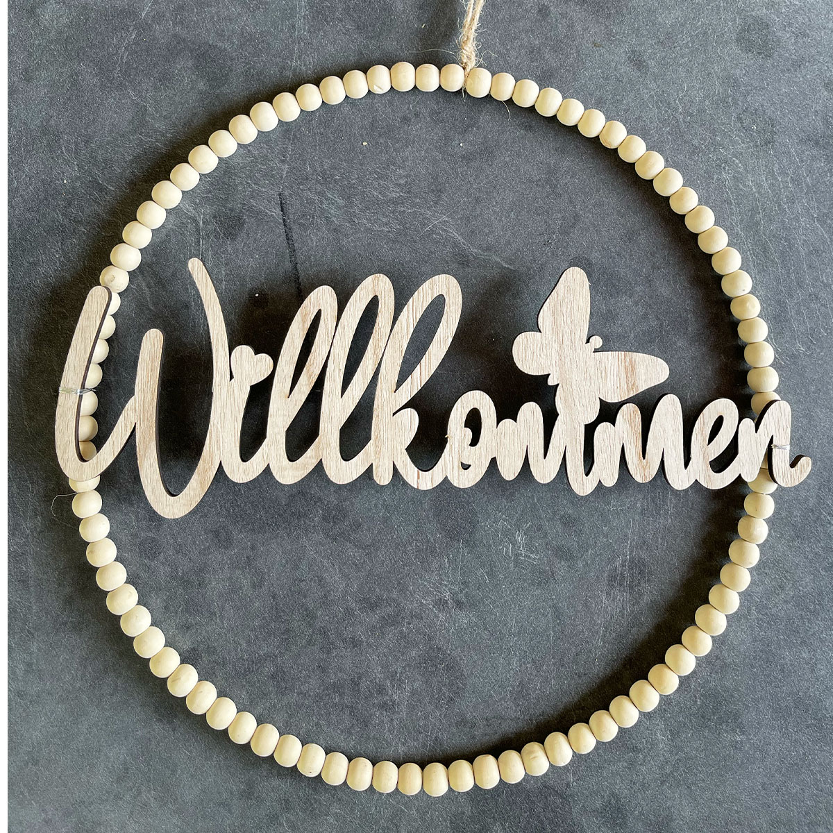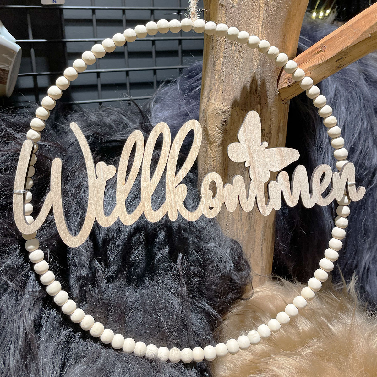 Deko Perlenring Willkommen, Ring aus Holzperlen mit Schriftzug Willkommen, Ø30cm, Holz