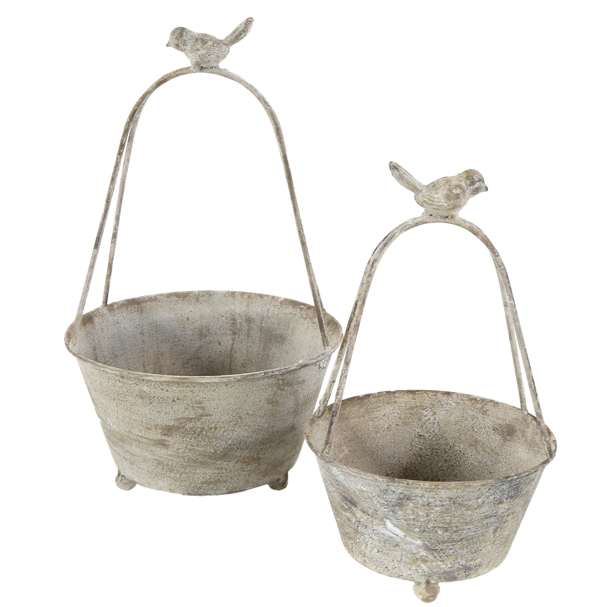 Deko Pflanztopf mit Bügel und Vogel, used look, antikgrau, 34cm, Metall