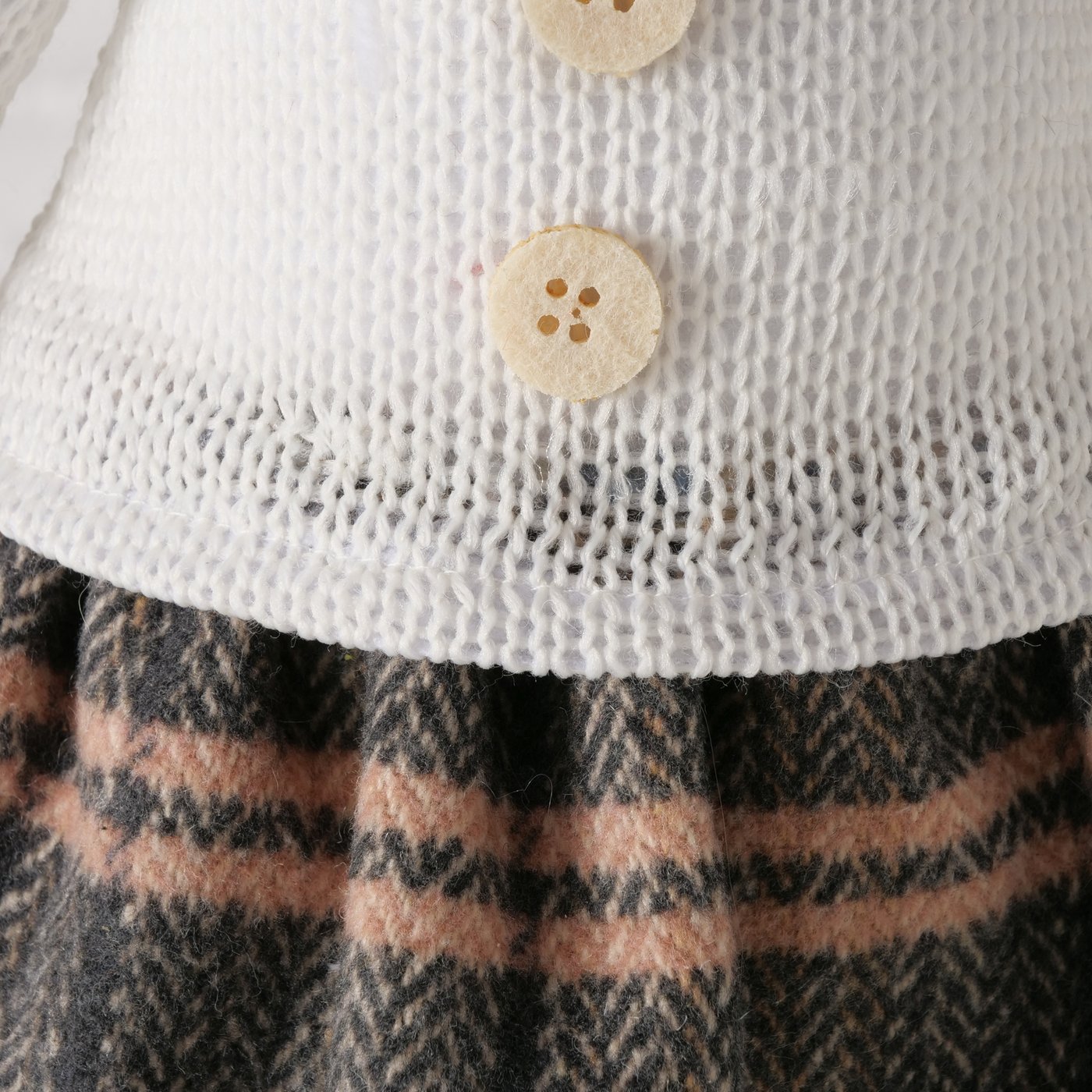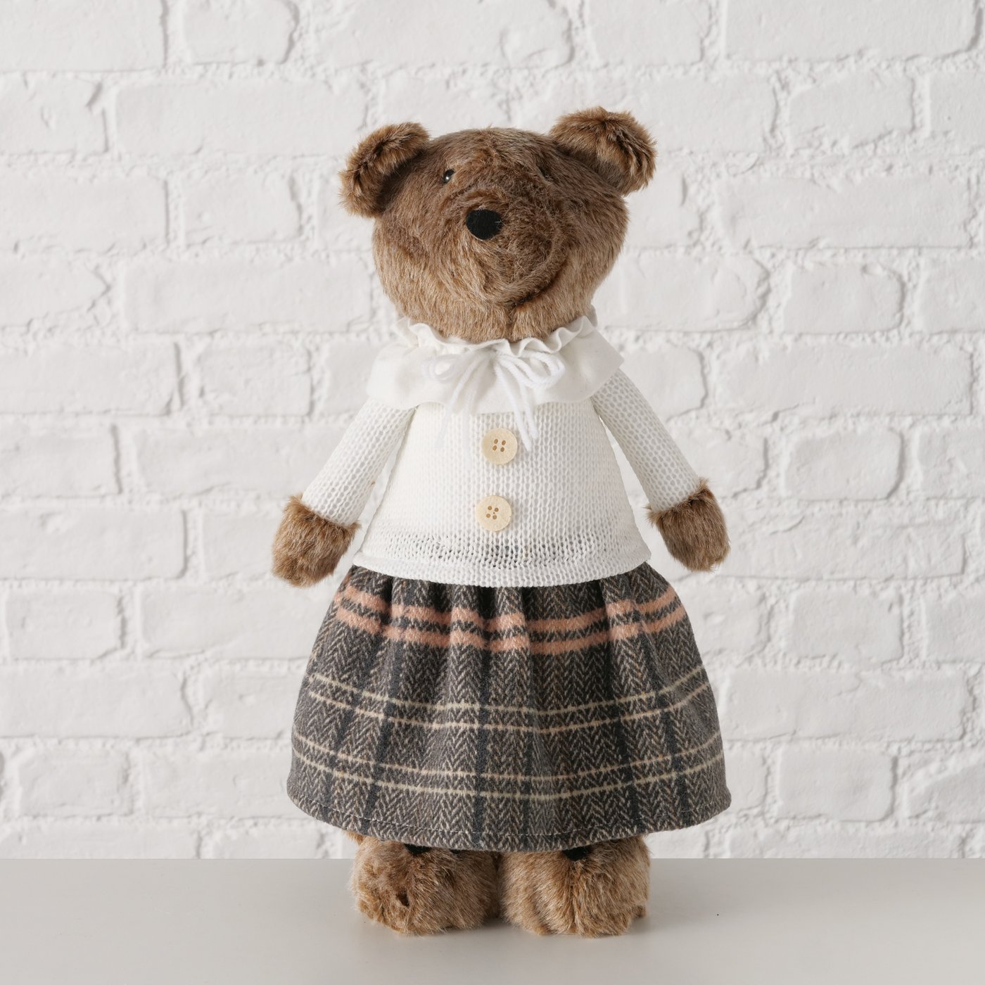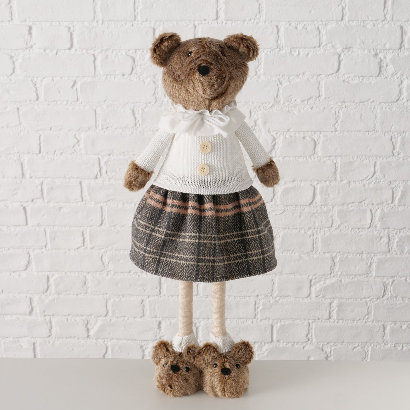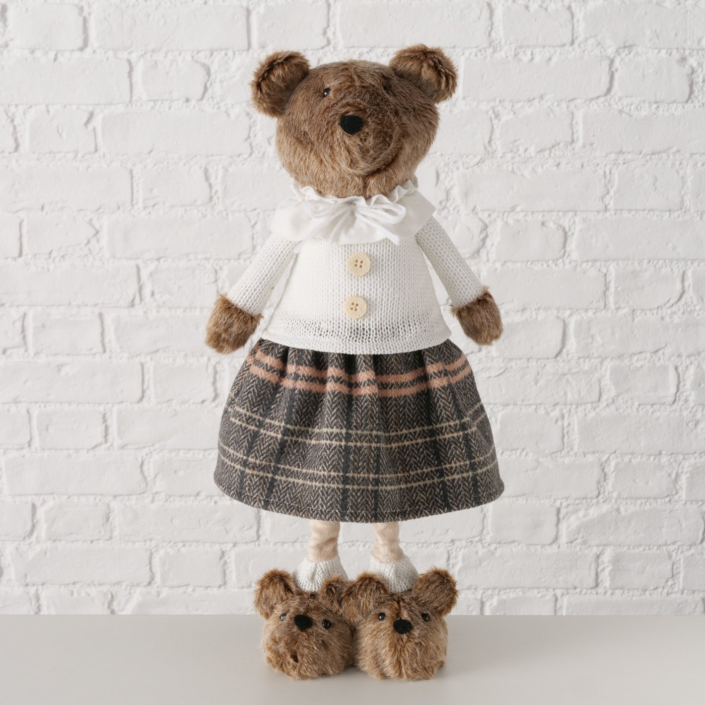 Die charmante Schwester von Teddie bringt eine ganz eigene, liebevolle Note in deine Dekoration. Mit ihrem karierten Rock, der feinen Bluse und den niedlichen „Hundeschuhen“ wirkt sie wie aus einer warmen Kindheitserinnerung – ruhig, freundlich und einfach zum Gernhaben.