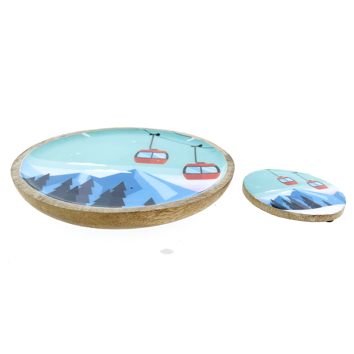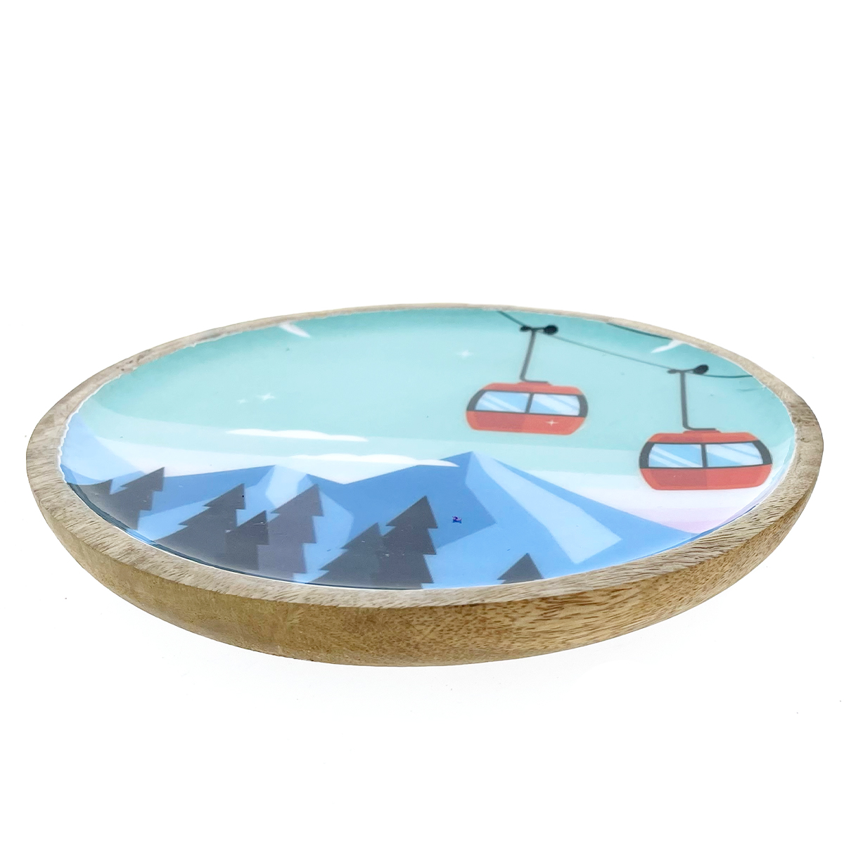 Deko Teller Gondel aus Mangoholz mit Bergmotiv und Seilbahn, Ø30cm