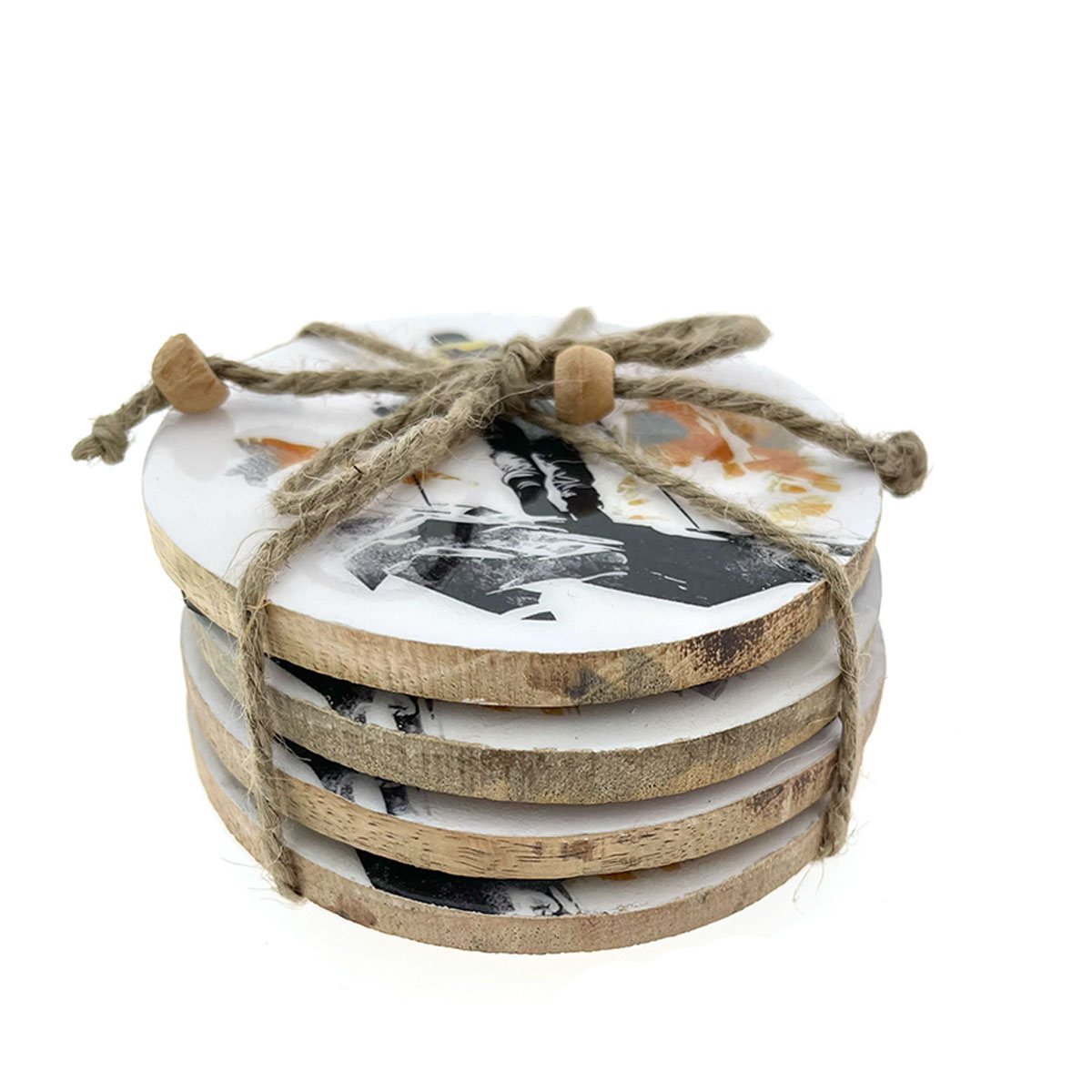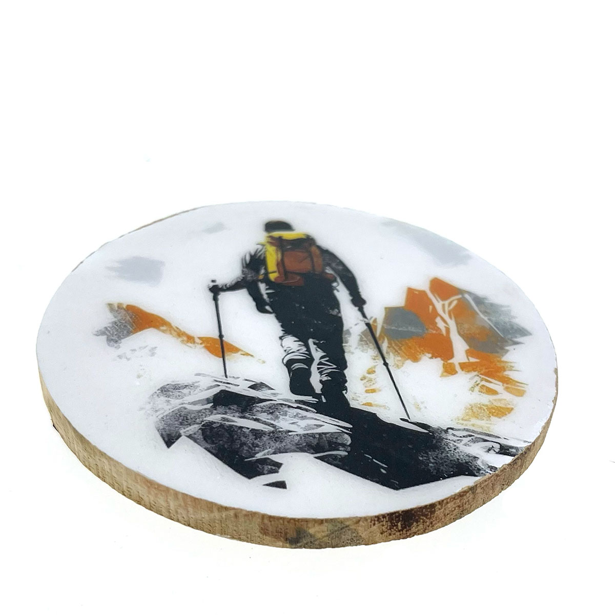 Deko Untersetzer Tourengeher, Holzuntersetzer mit Lackküberzug und Bergmotiv mit Bergwanderer, Ø10cm. 4St/Pck