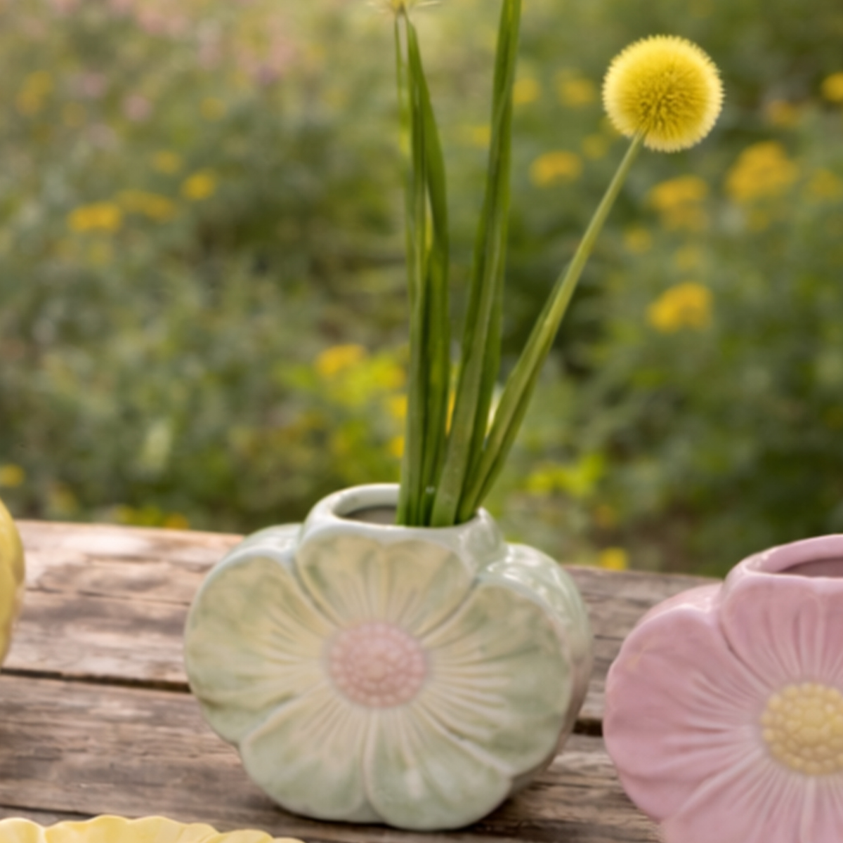 Gefertigt aus Keramik, passt die Vase wunderbar zum Landhausstil, zu fröhlicher Frühlingsdeko oder sommerlicher Tischgestaltung. Besonders harmonisch wirkt sie in Kombination mit den passenden Blütentellern oder Kerzenhaltern in Blütenform aus Keramik.