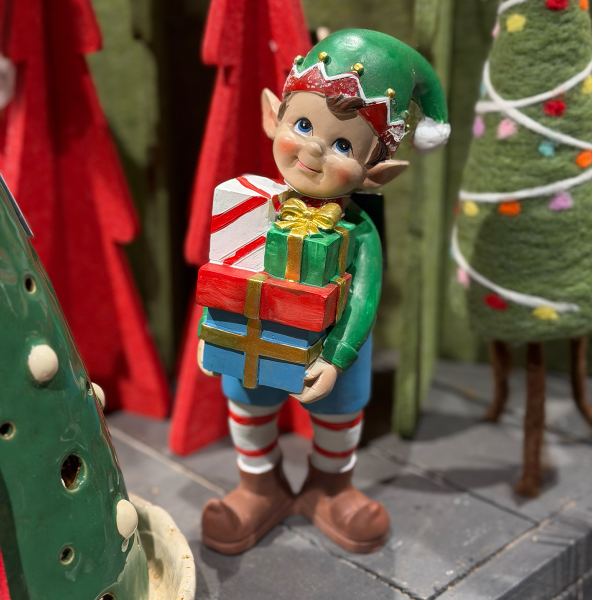 Mit seinen liebevoll bemalten Details, der grünen Zipfelmütze, den rot-weiß gestreiften Strümpfen und seinem charmanten Lächeln sieht er aus, als käme er direkt aus dem hohen Norden – oder vielleicht aus der Werkstatt des Weihnachtsmannes in Amerika.