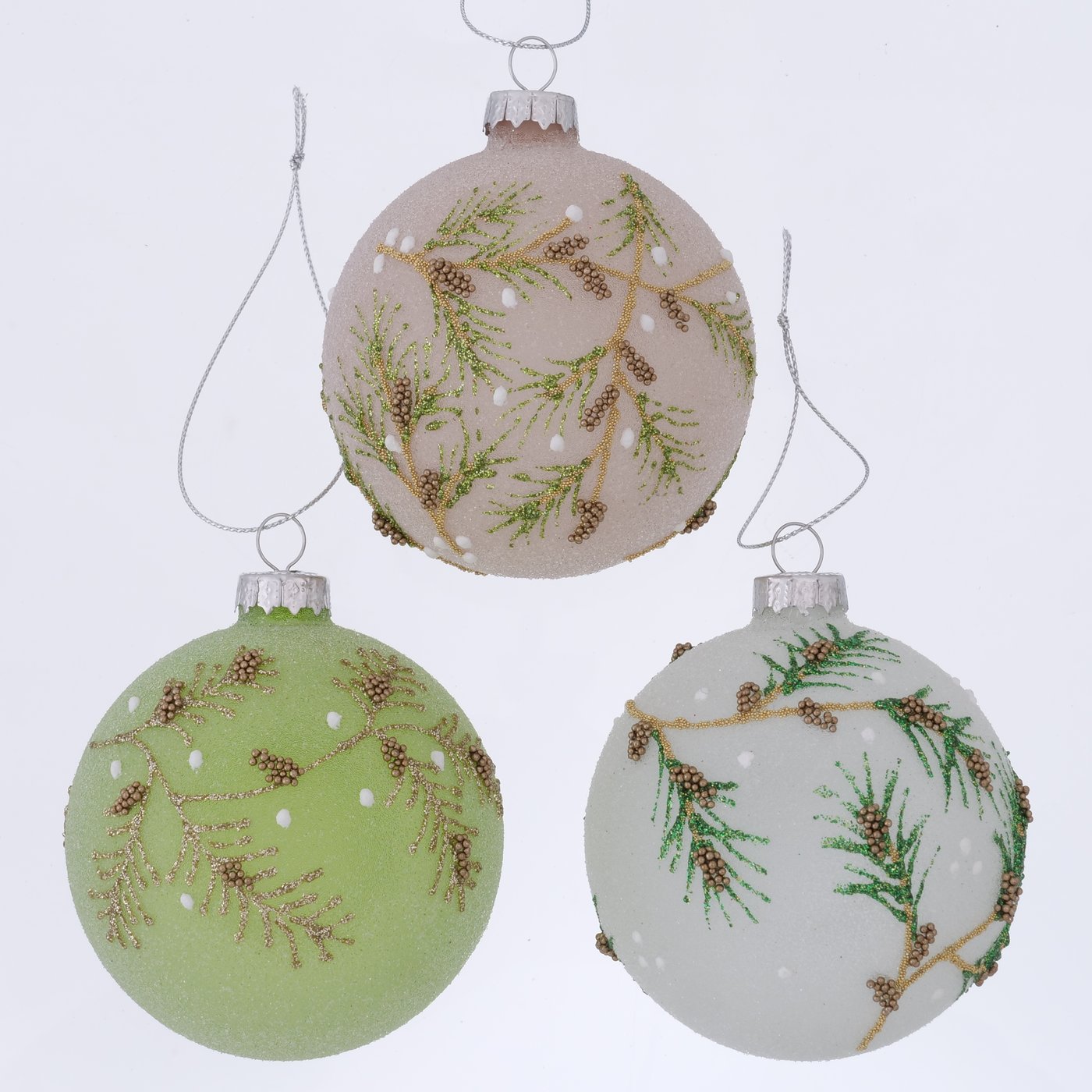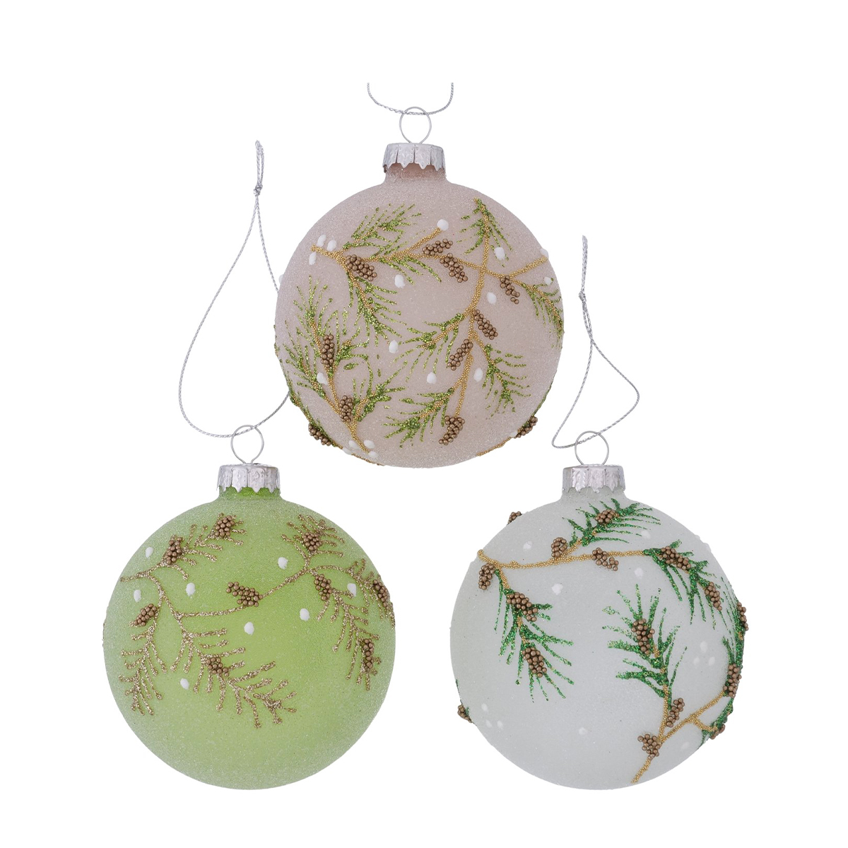 Produktinformationen "Deko Weihnachtskugeln Mikos, Glaskugeln mit filigraner Zapfengirlande"
