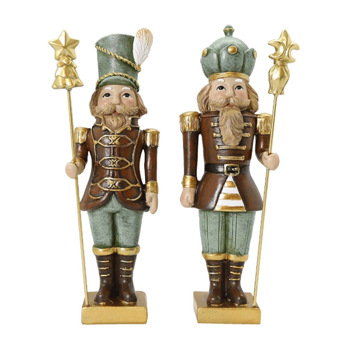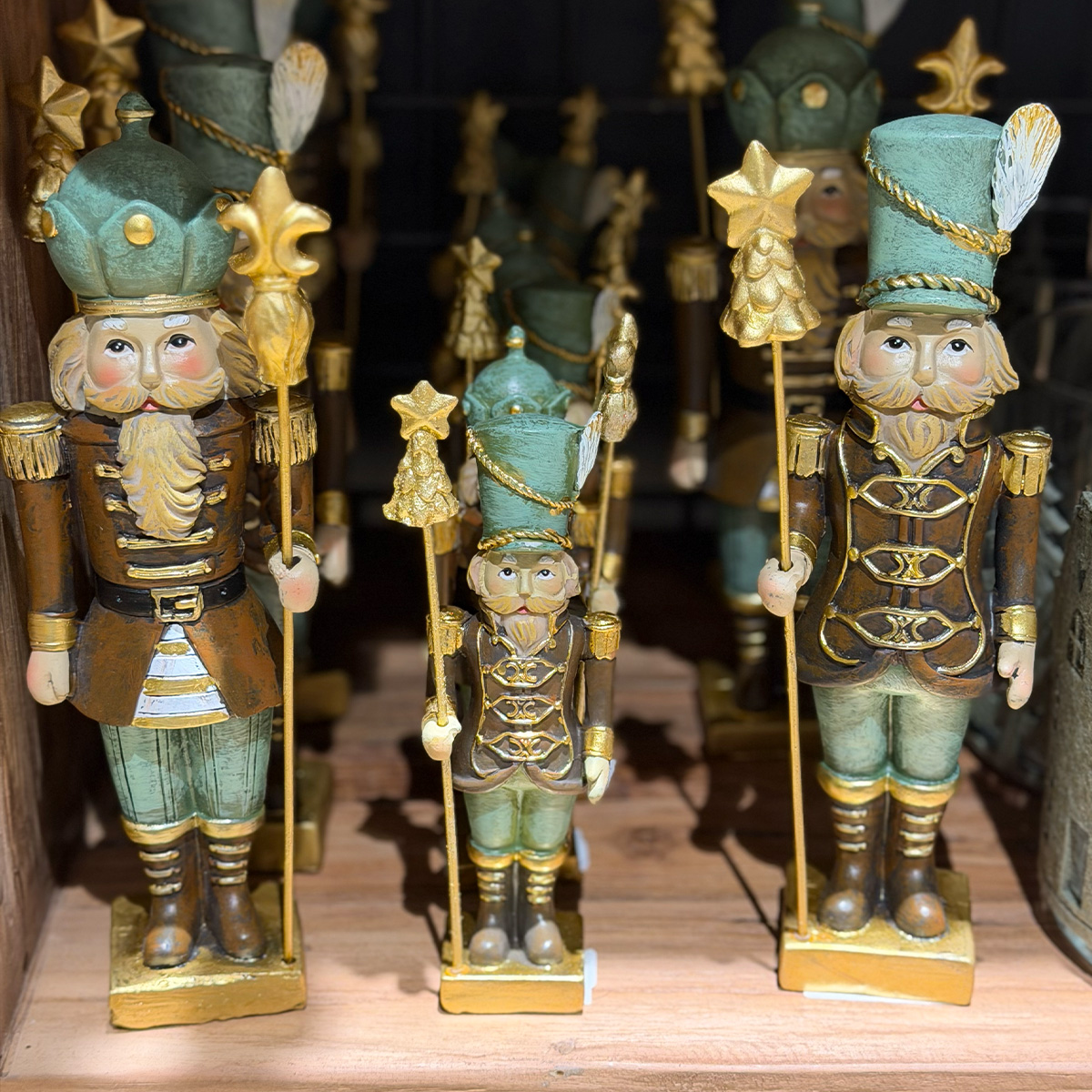 Mit seinem goldenen Zepter, den fein gearbeiteten Details und den warmen Farbtönen aus Grün, Braun und Gold wirkt er wie eine Figur aus einem klassischen Weihnachtsmärchen.