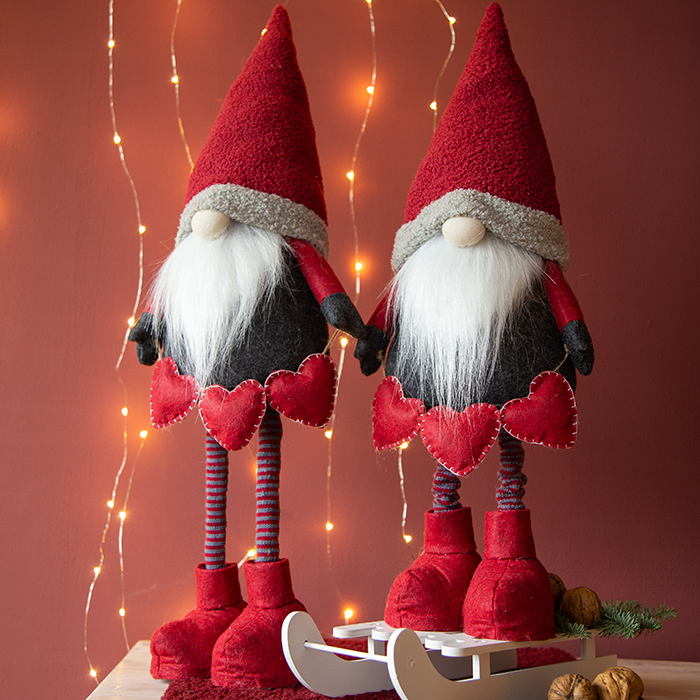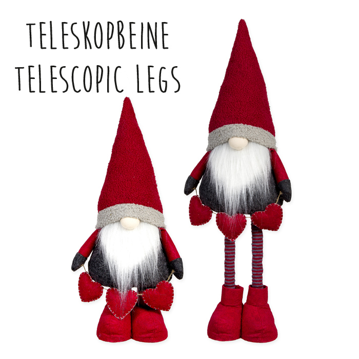 Deko Wichtel, Stoffwichtel mit Teleskopbeine, Plüschmütze und Herzen, 70cm